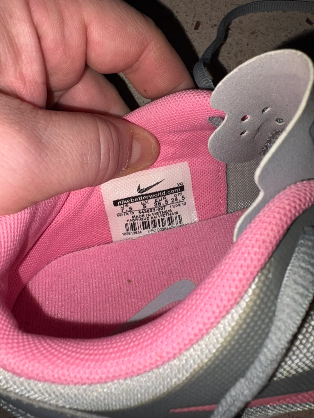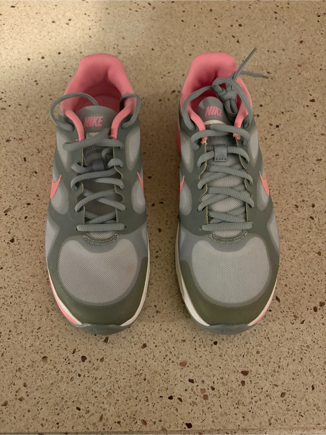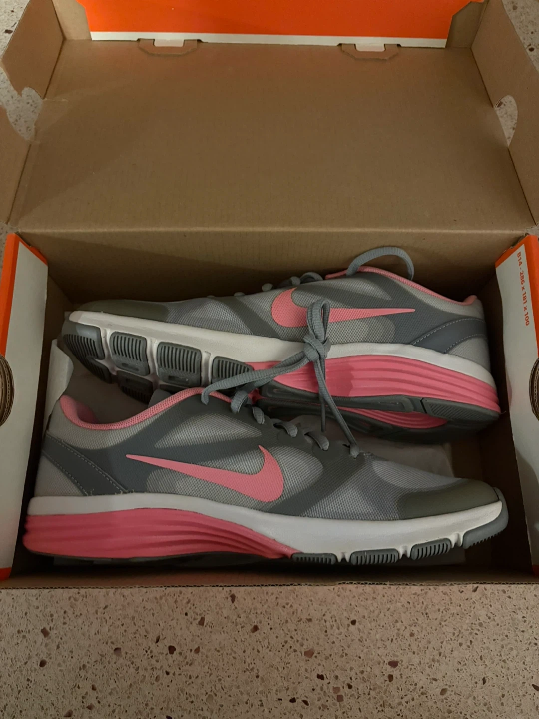 These are Nike women's running shoes in grey and pink. Size is 7.5 US women's. Comes with original box.