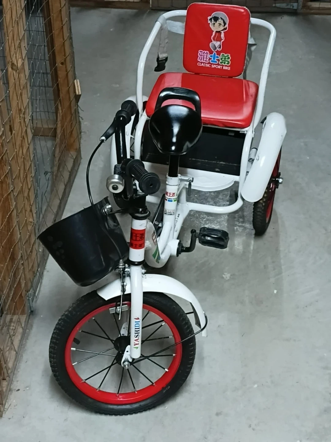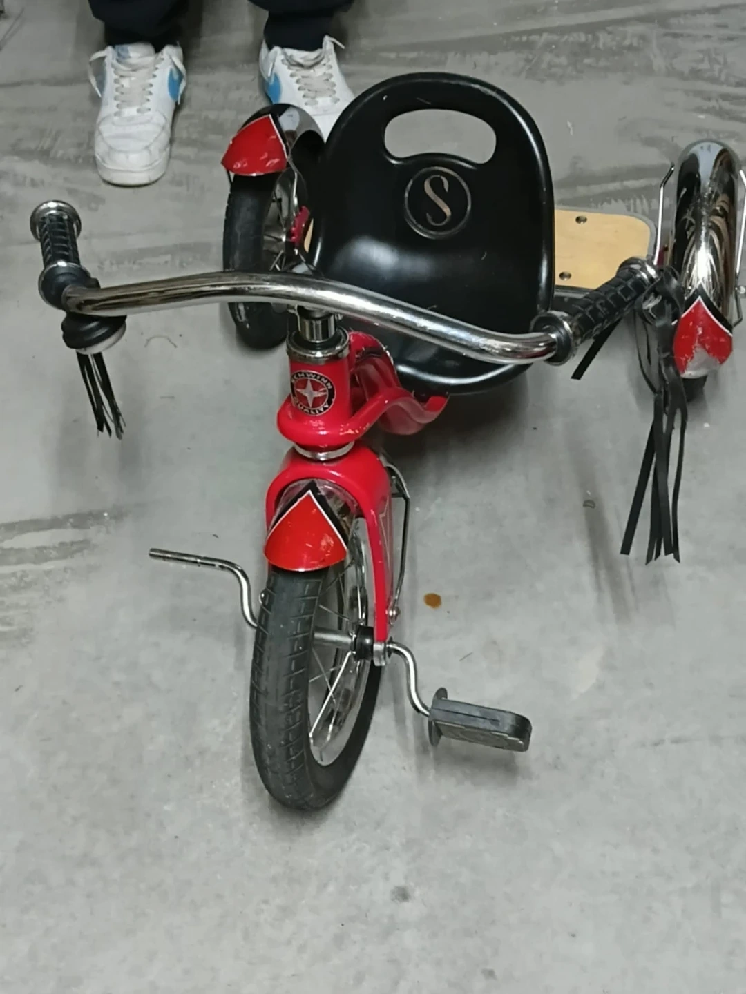Classic red children's tricycle. Sturdy metal frame with rubber grips and pedals. Features a comfortable black seat and large rear wheels for stability. Great for little ones learning to pedal!