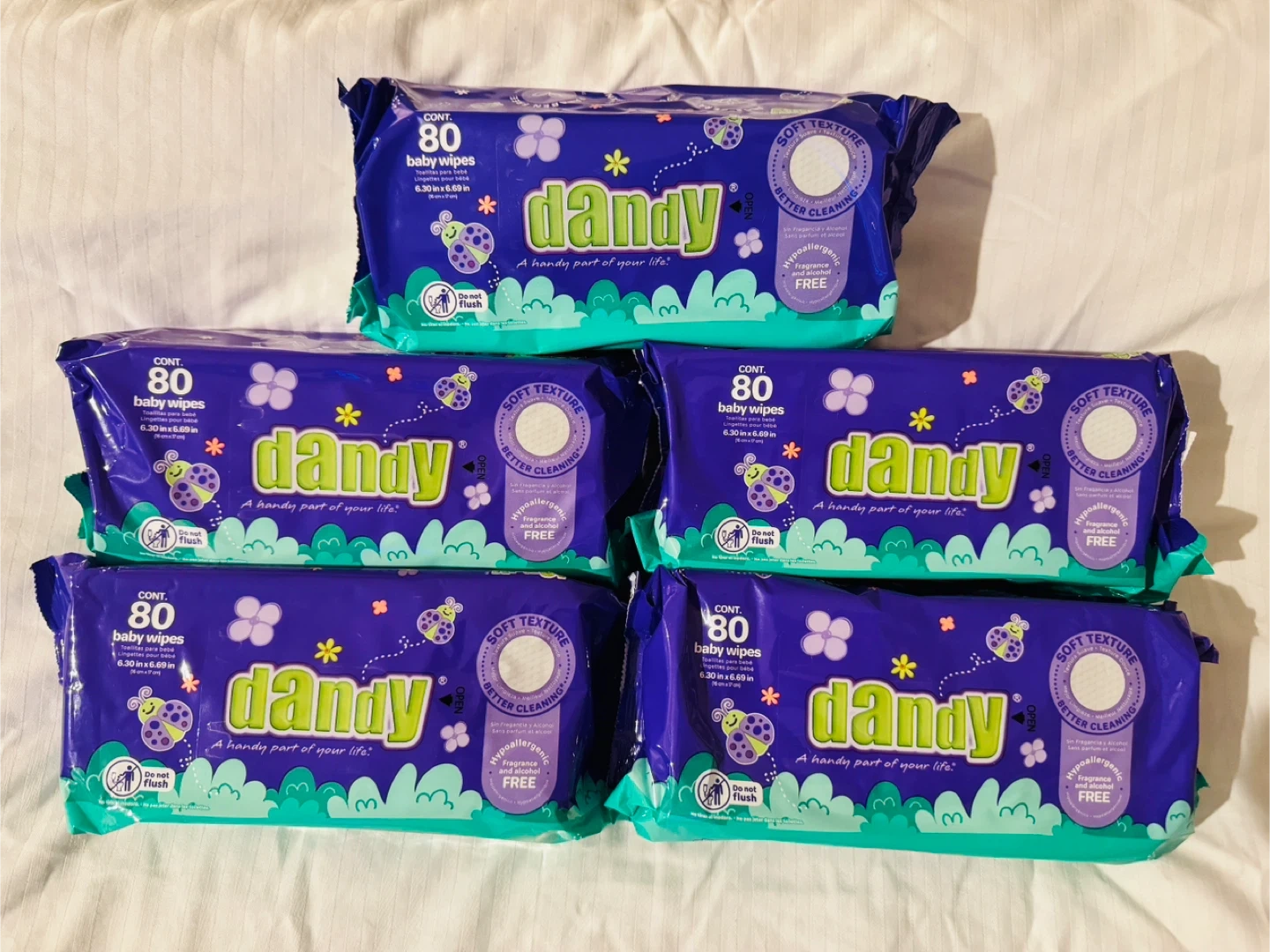 This is a 5-pack of Dandy brand baby wipes. Each pack contains 80 wipes, totaling 400 wipes. They're fragrance and alcohol-free. The wipes are hypoallergenic and have a soft texture for better cleaning. Dimensions are 6.30 x 6.69 inches per wipe.