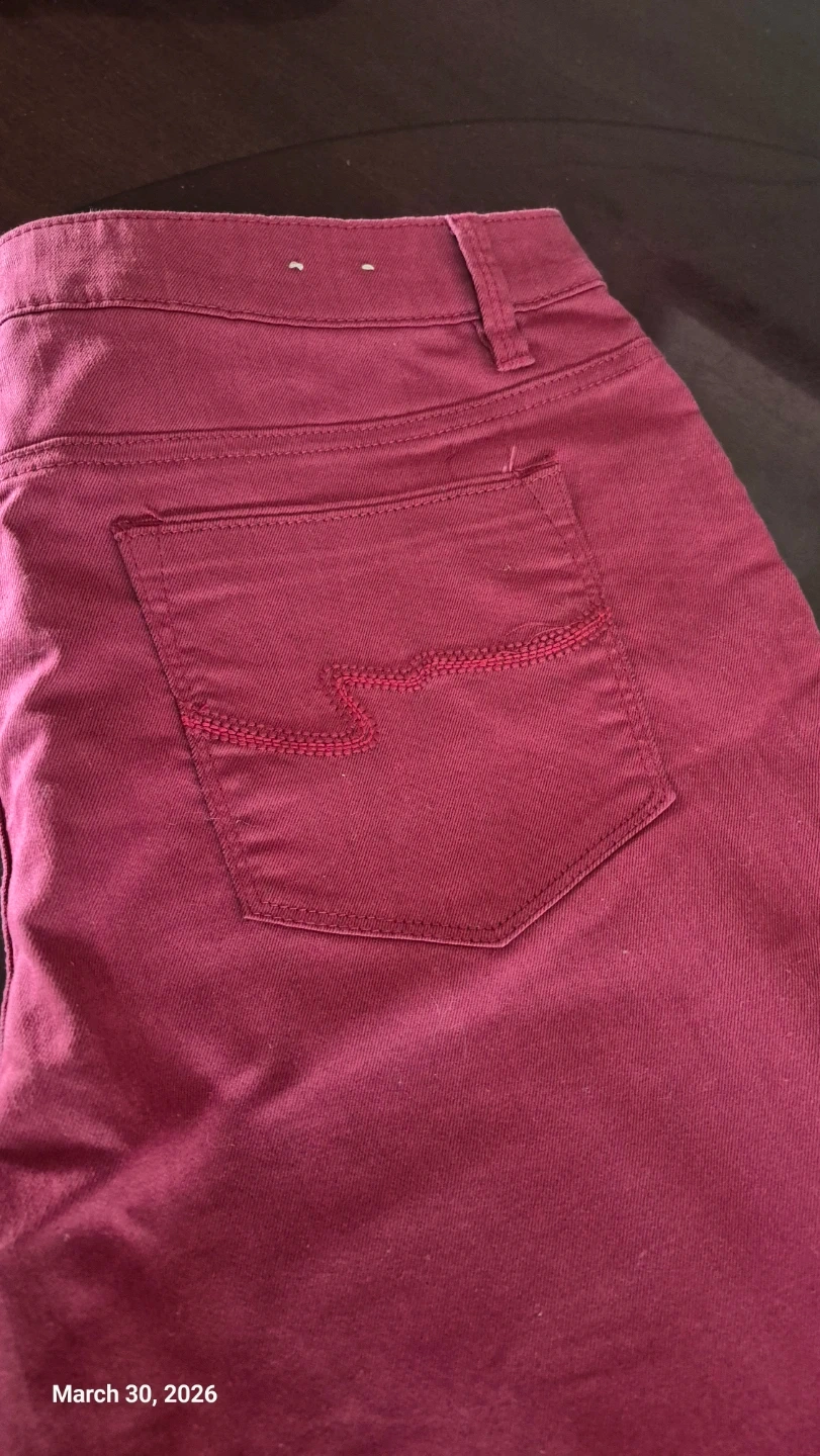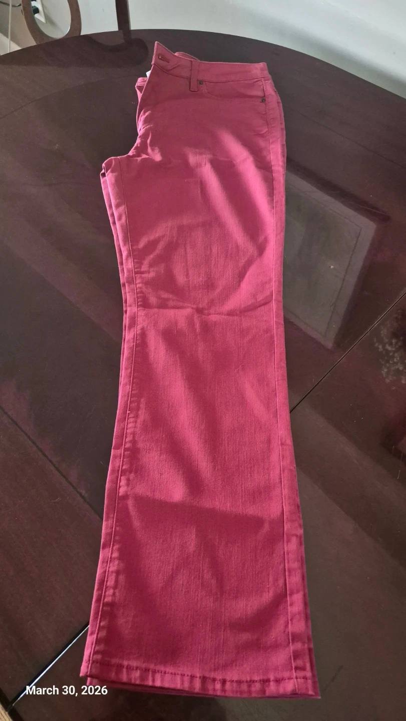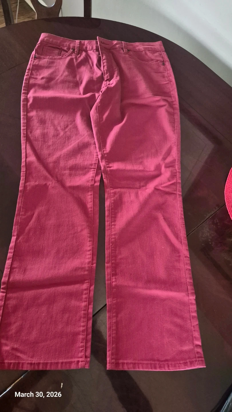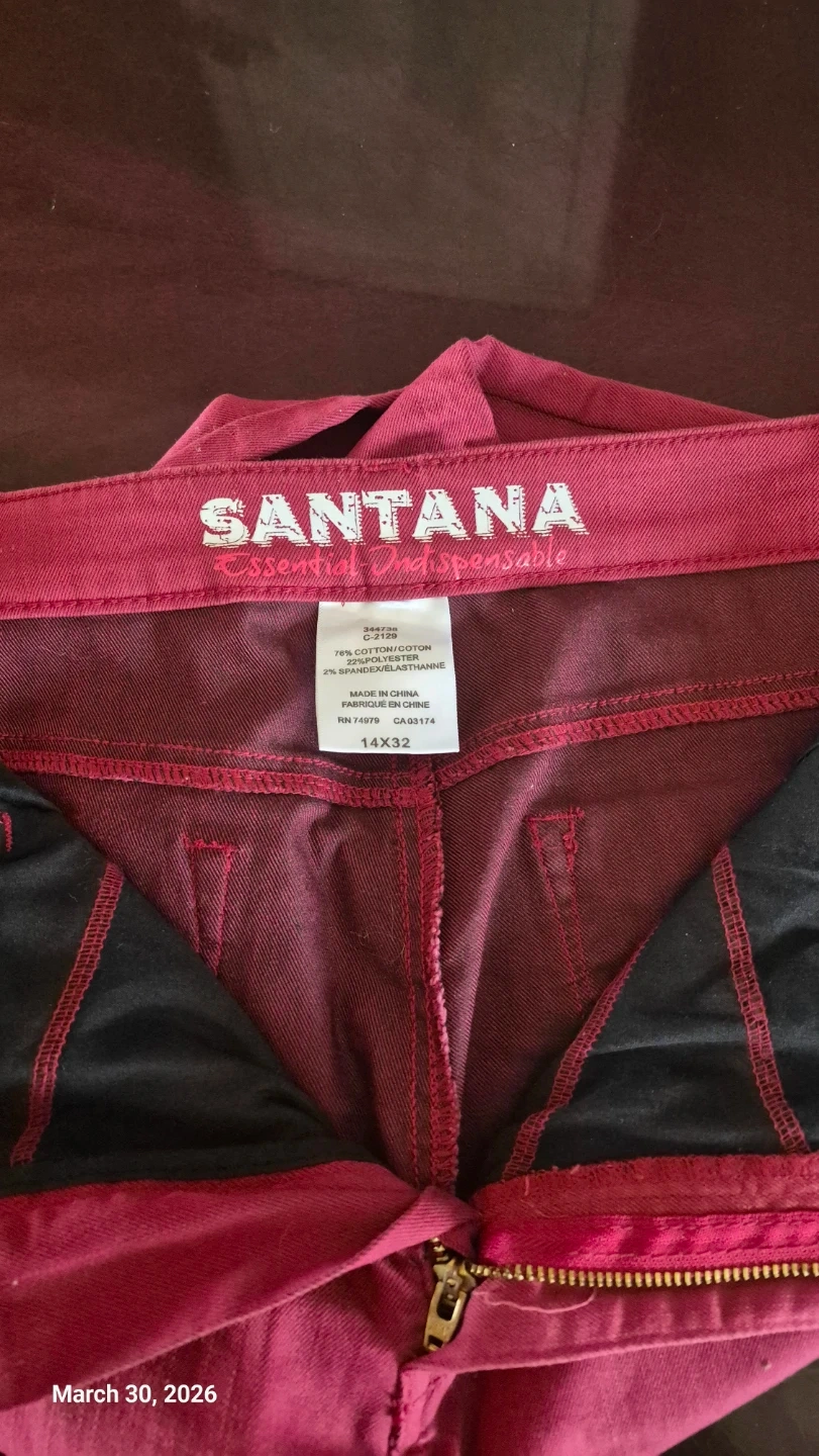 Santana Essential Denim jeans in a berry colour. These flared jeans are size 14x32 and made with 78% cotton, 20% polyester, and 2% spandex. They feature a classic five-pocket style. Great for casual wear!