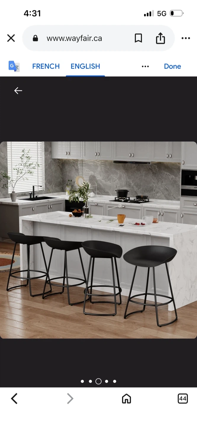 Set of four black bar stools with a 360-degree swivel. These stools have a modern design and metal frame. They're great for adding extra seating to your kitchen island or bar area. Stool seat is black.