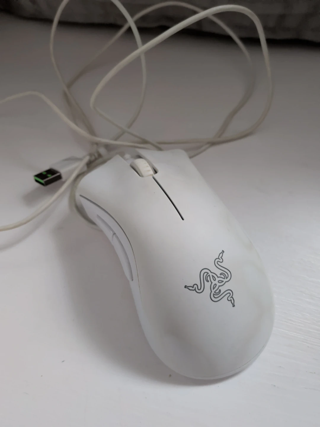 This is a white Razer wired gaming mouse. It features a scroll wheel and ergonomic design for comfortable use. It's a reliable peripheral for gaming setups. Works great. Just for a smaller mouse.