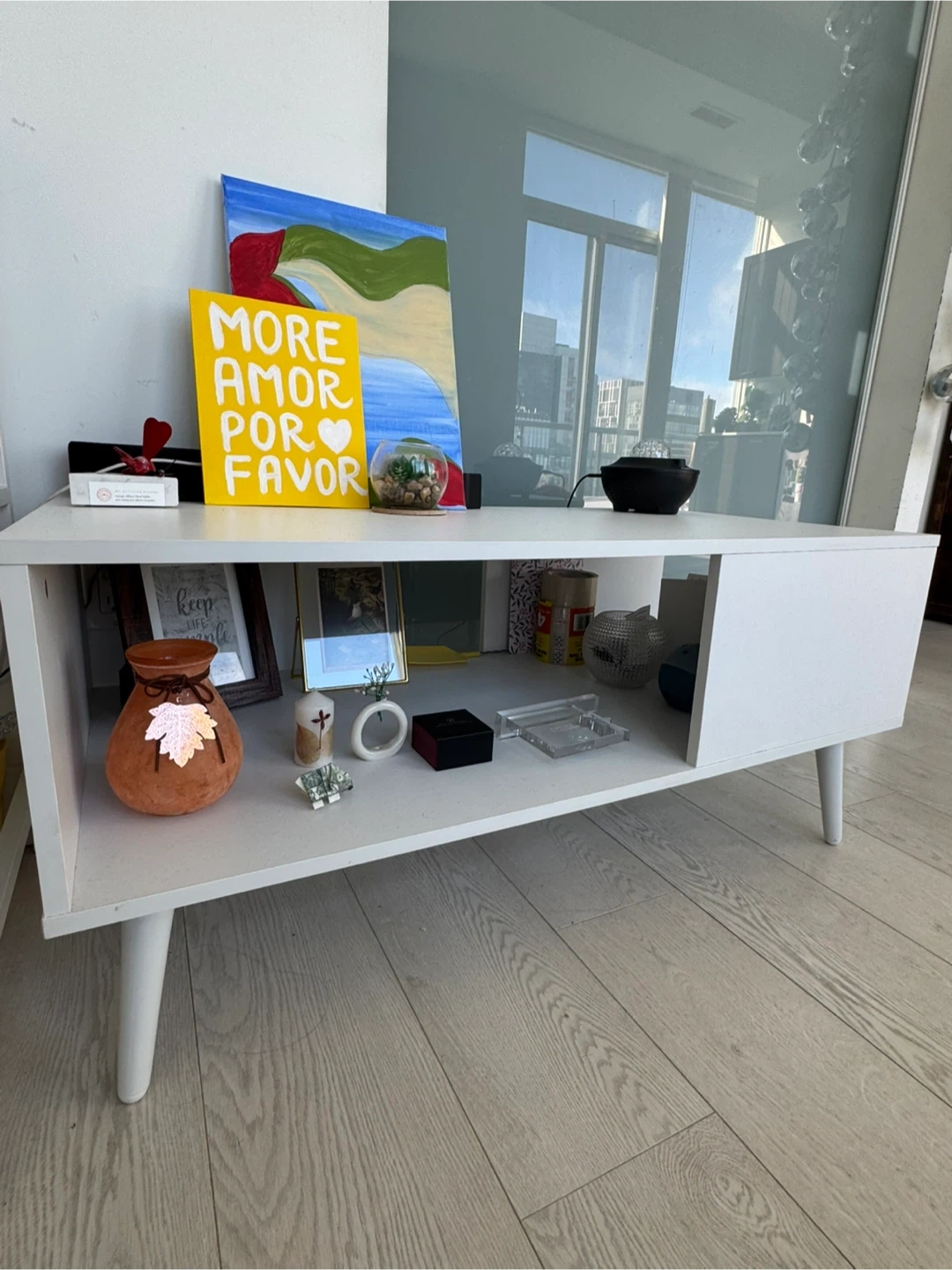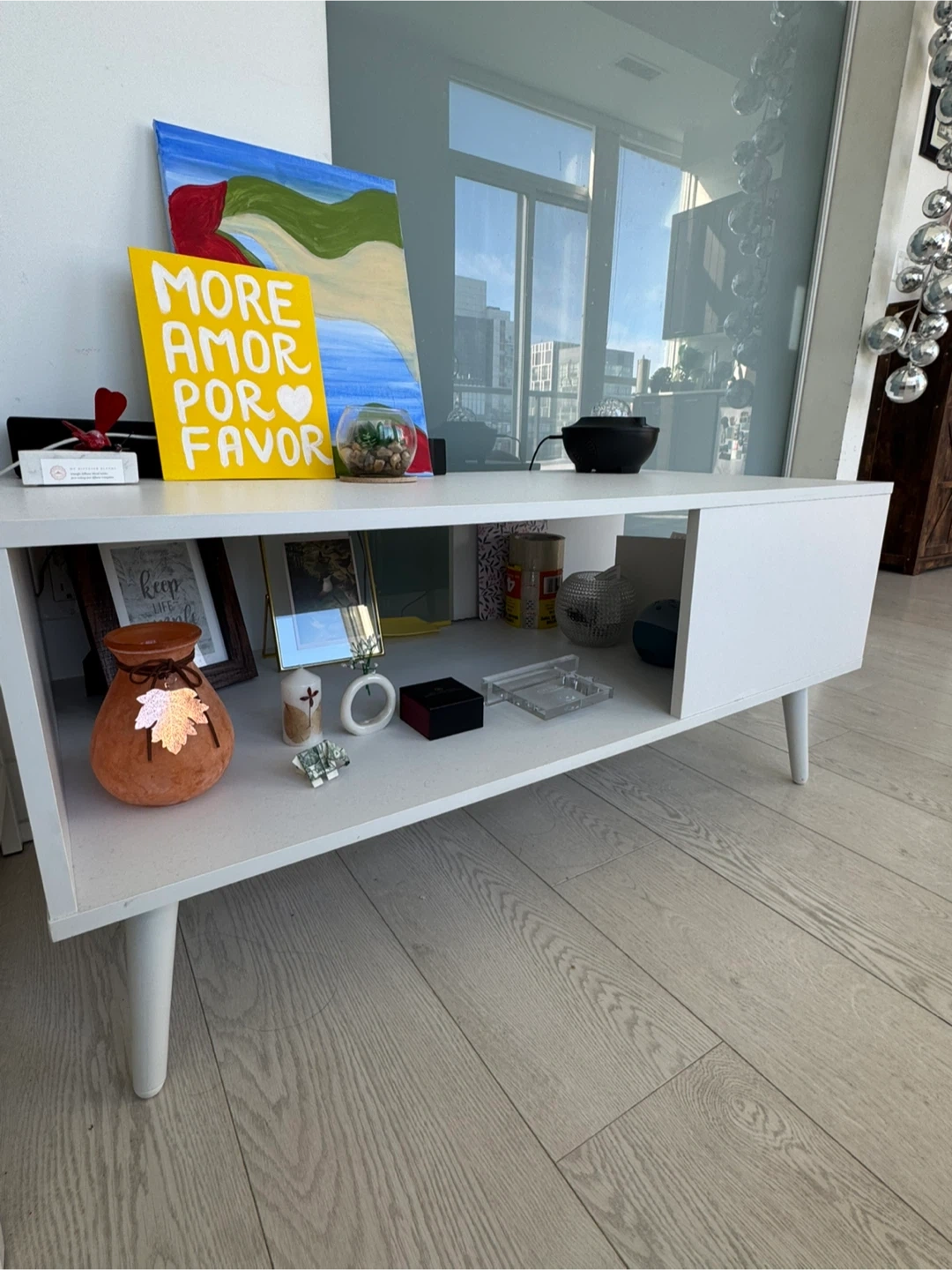 Selling a modern white TV table that can also be used as a coffee table, console table, or low storage unit.