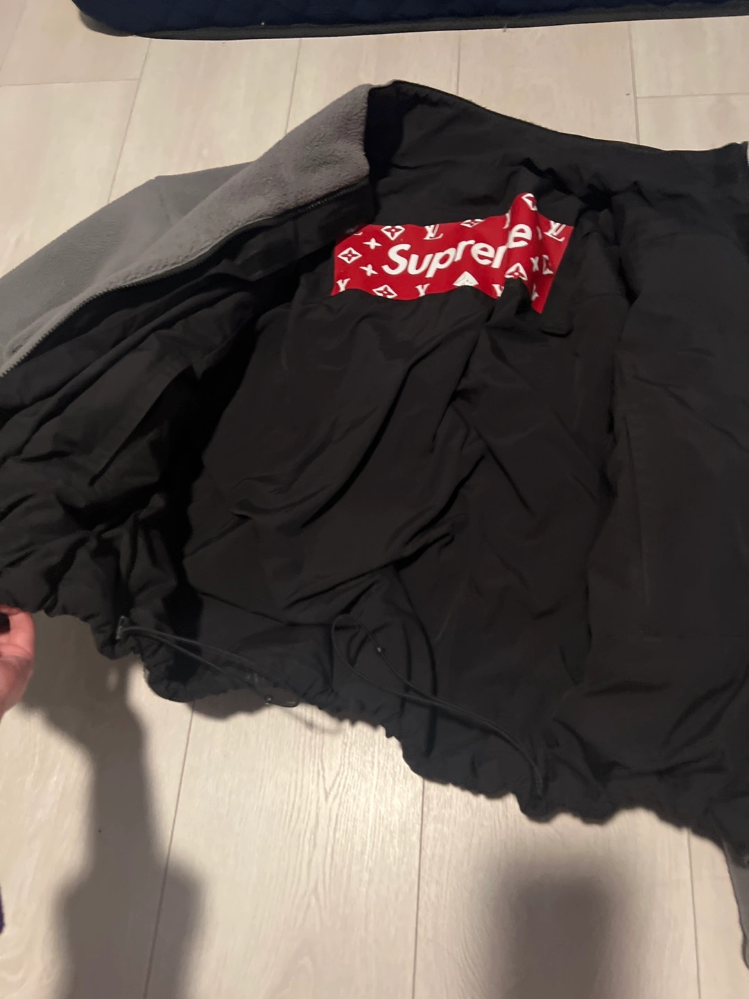 Selling a grey The North Face fleece jacket. It has a black pocket on the chest and a Supreme logo on the inside lining. Perfect for staying warm!