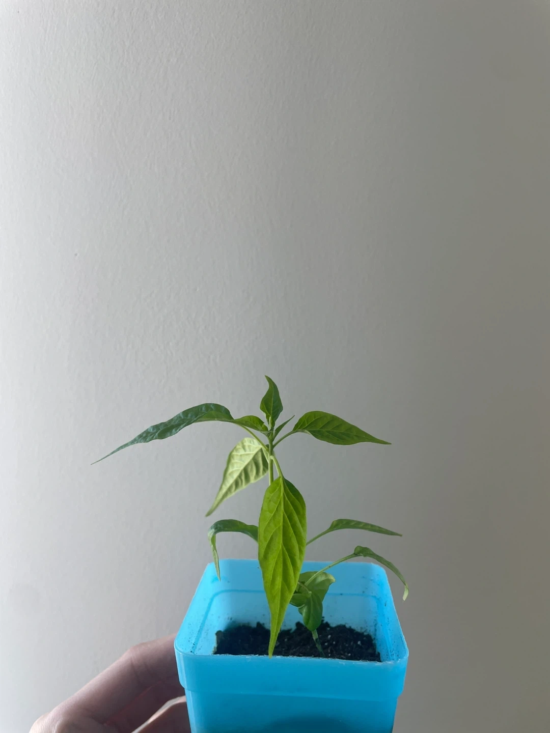 This is a young chilli pepper seedling. It's currently growing in a small blue pot and is showing healthy new growth. Perfect for starting your own pepper plants this season!