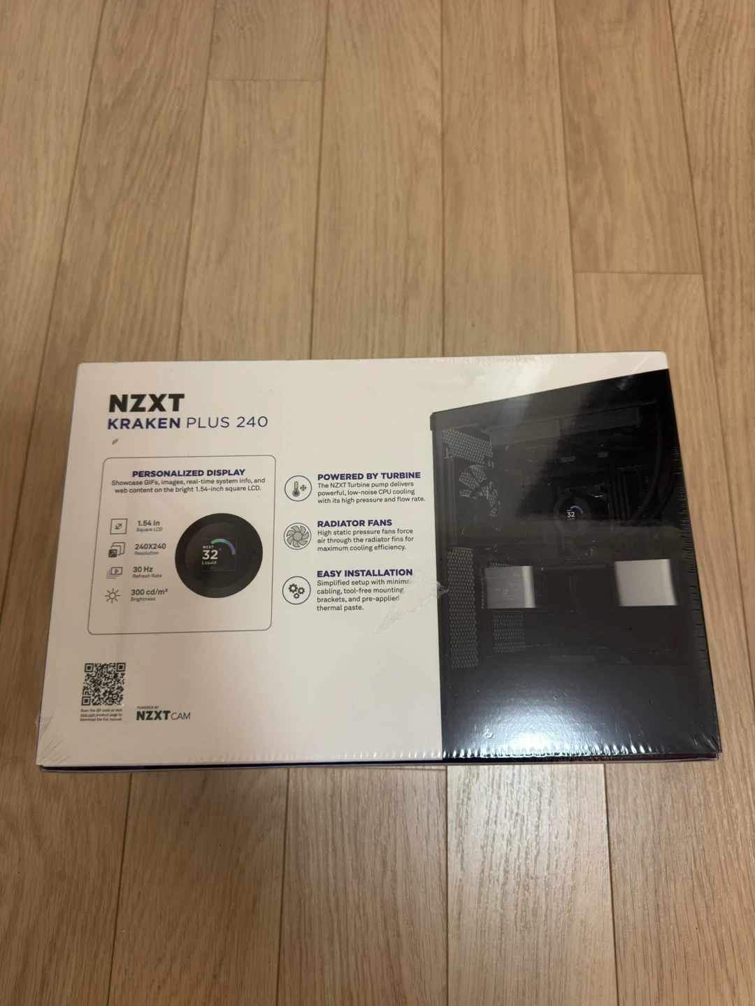 Brand new NZXT Kraken Plus 240 AIO liquid cooler. This is a 240mm cooler with a 1.54 inch square LCD display. The display has 240x240 resolution, 30 Hz refresh rate, and 300 cd/m² brightness. It has a powerful turbine pump and high static pressure radiator fans. Easy installation with pre-applied thermal paste. Color is black.