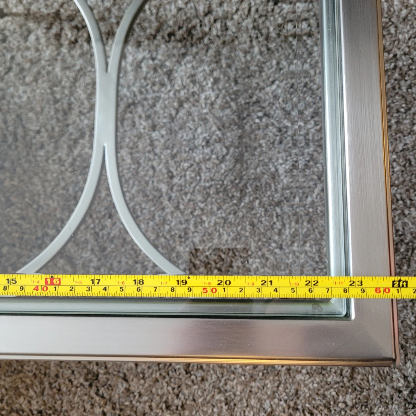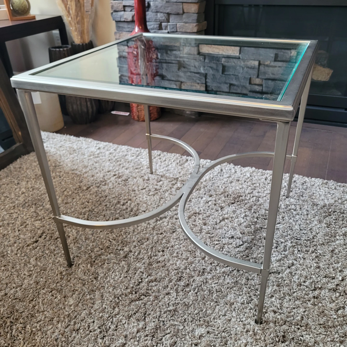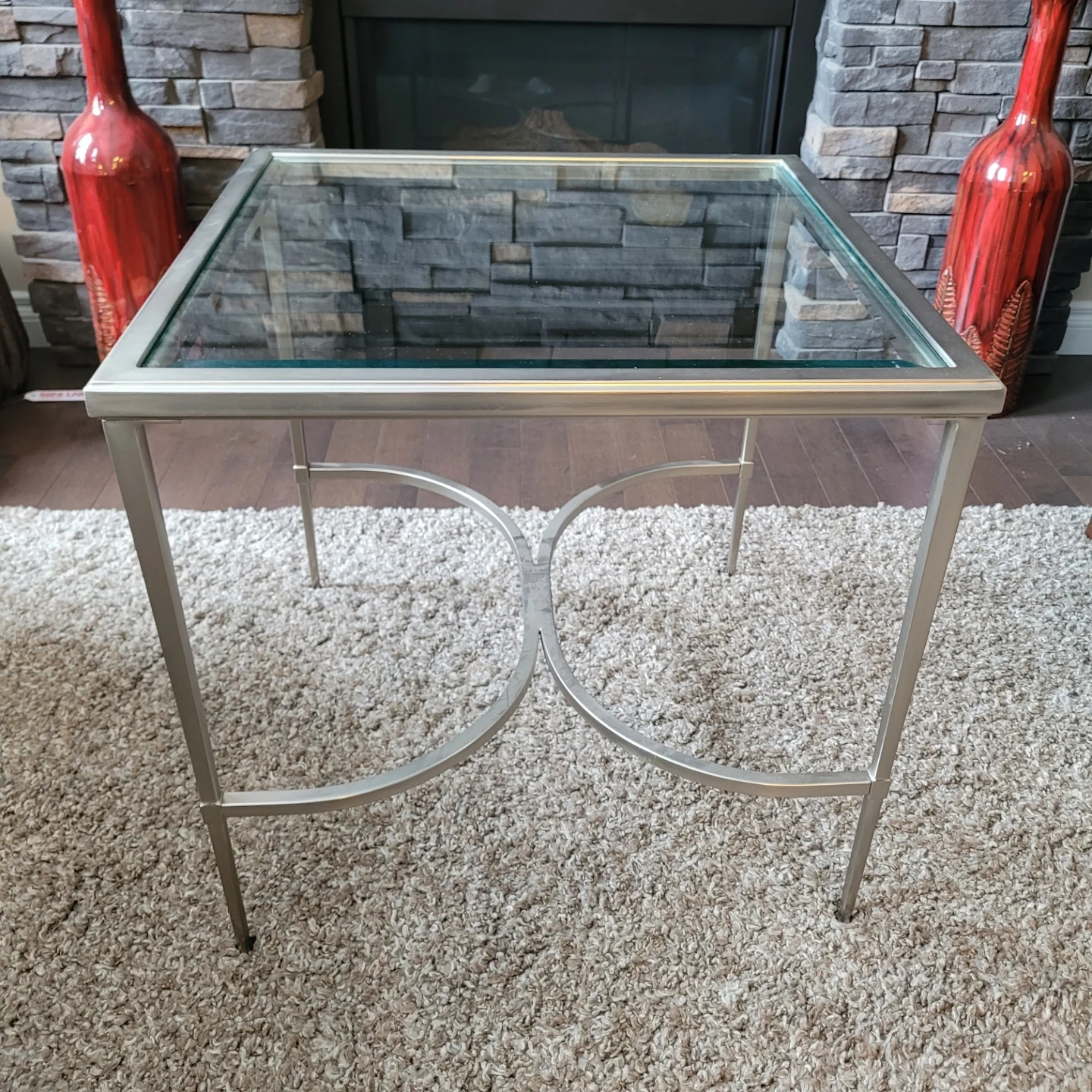 Glass top side table with a brushed metal frame. It has a decorative curved support under the tabletop. The dimensions are approximately 24 inches by 24 inches, and it stands about 23 inches tall. This table adds a modern touch to any living space.