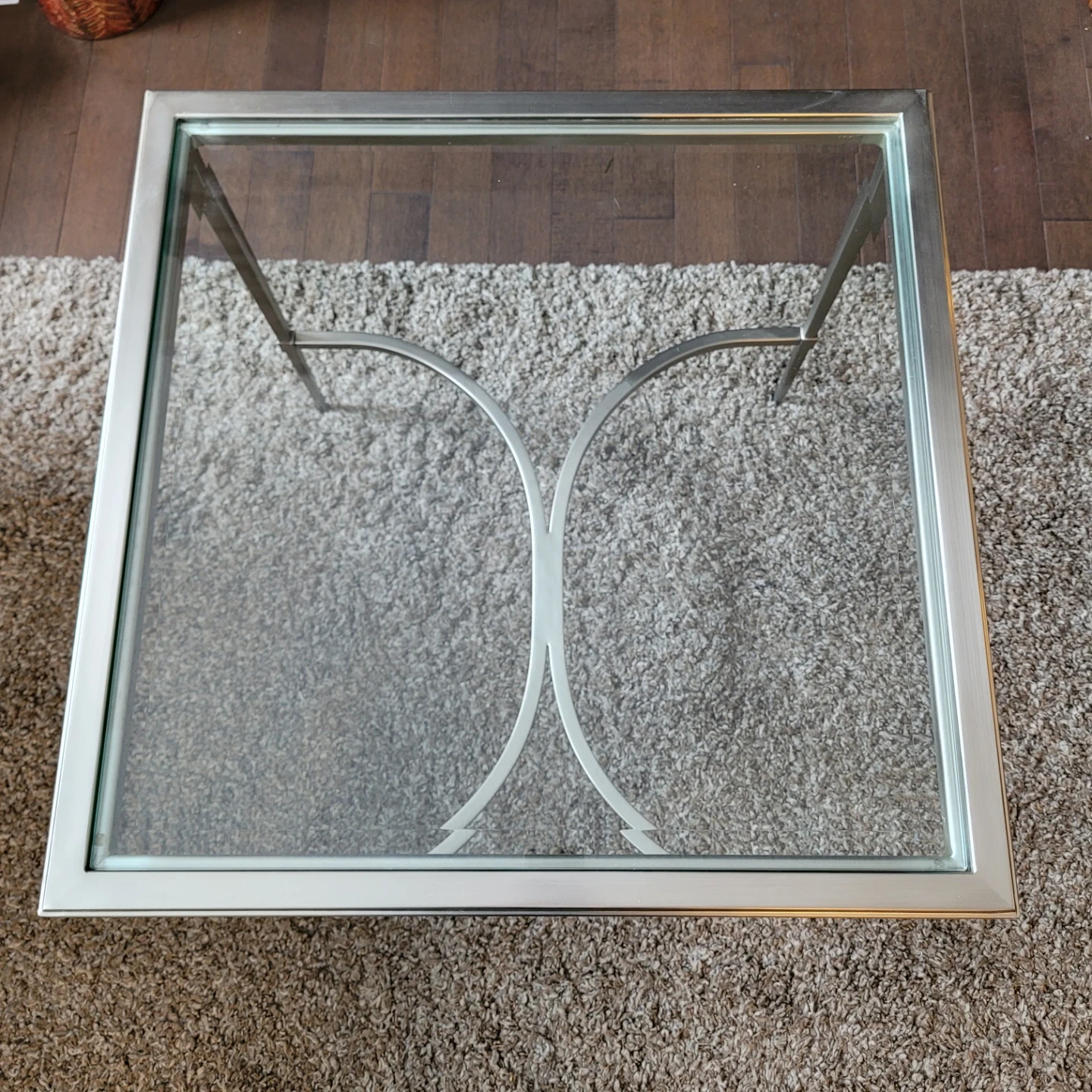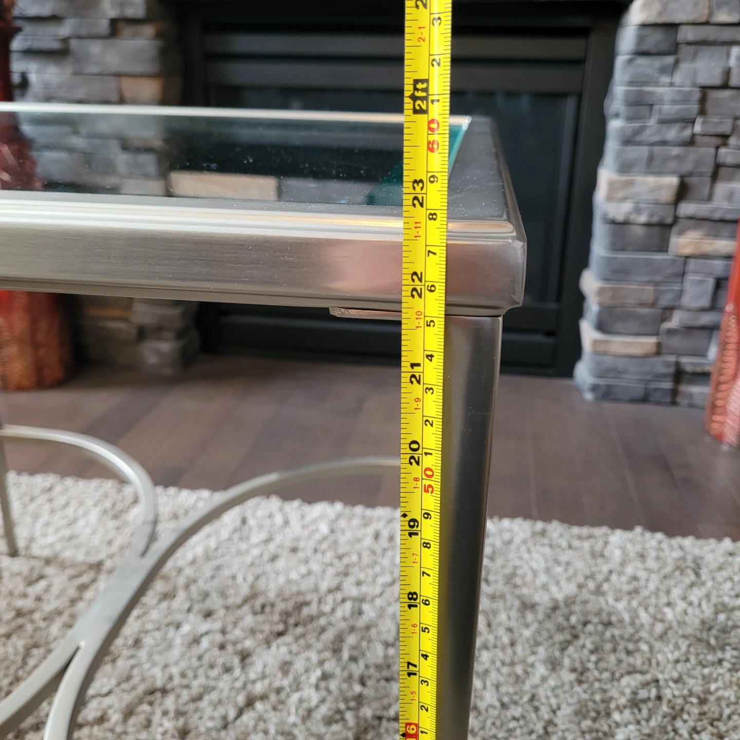Glass top side table with a brushed metal frame. It has a decorative curved support under the tabletop. The dimensions are approximately 24 inches by 24 inches, and it stands about 23 inches tall. This table adds a modern touch to any living space.