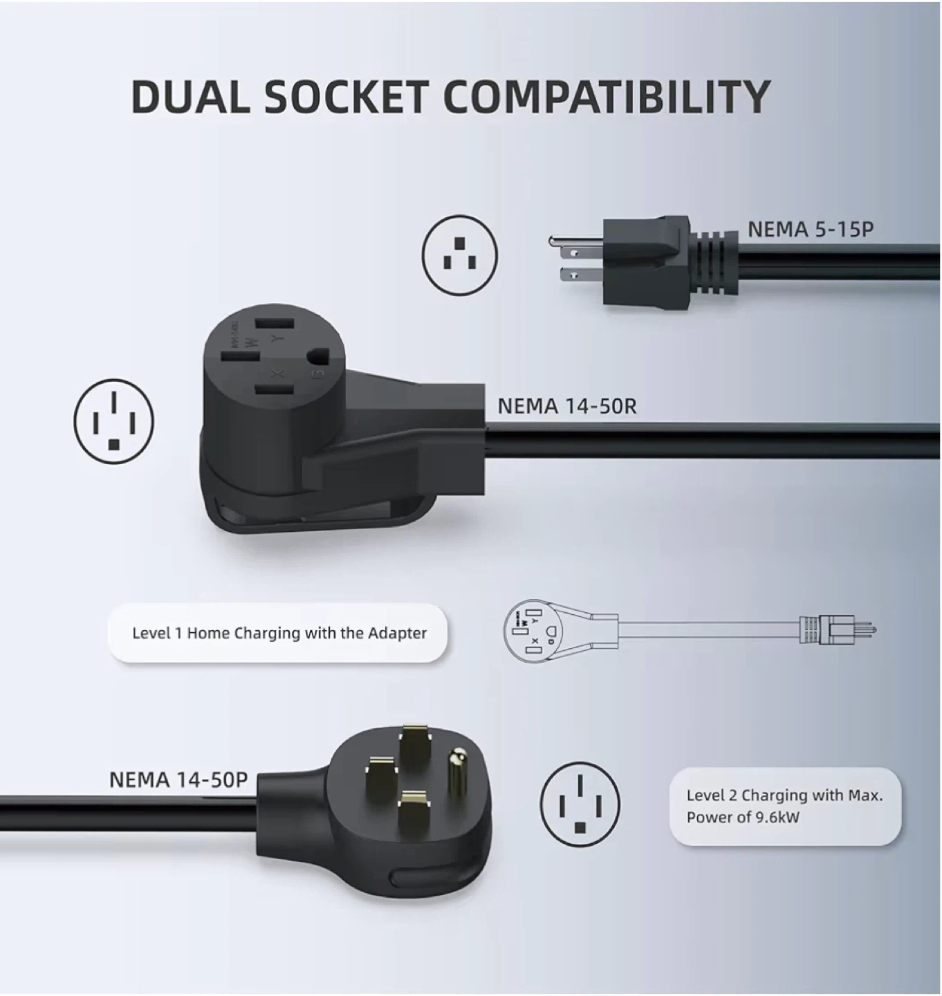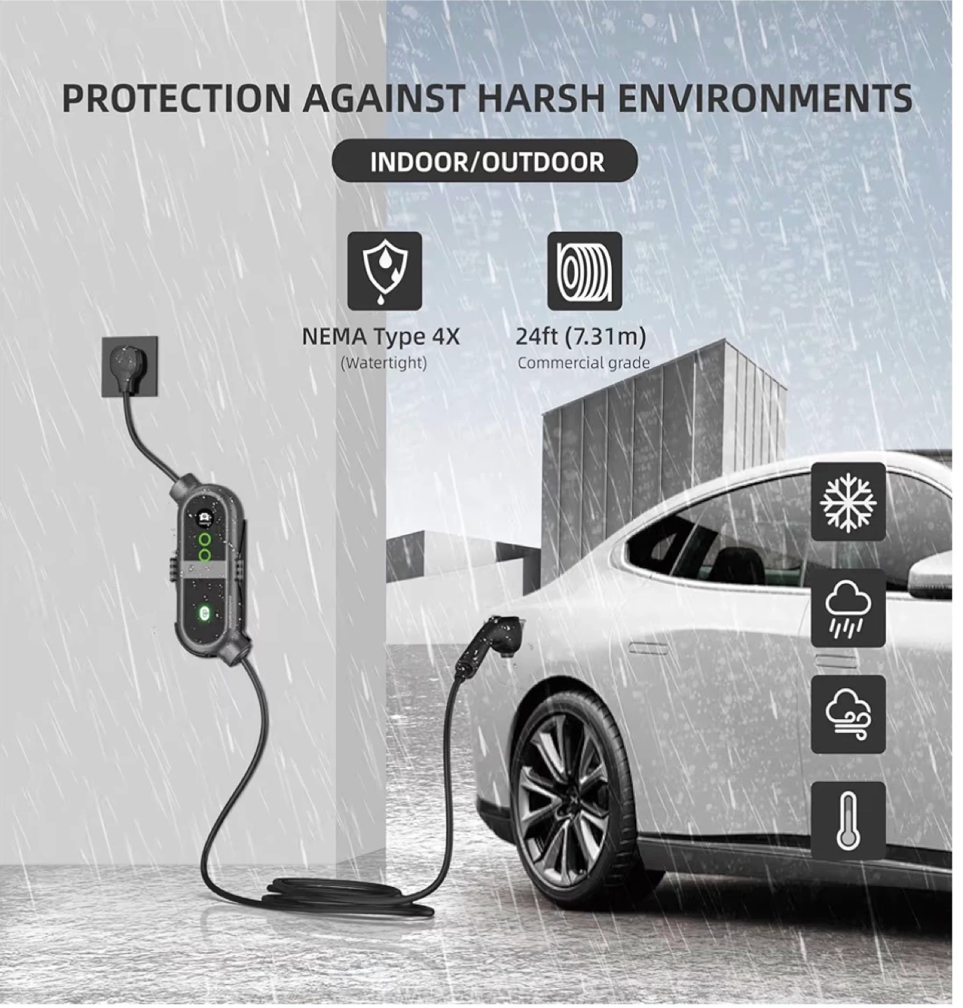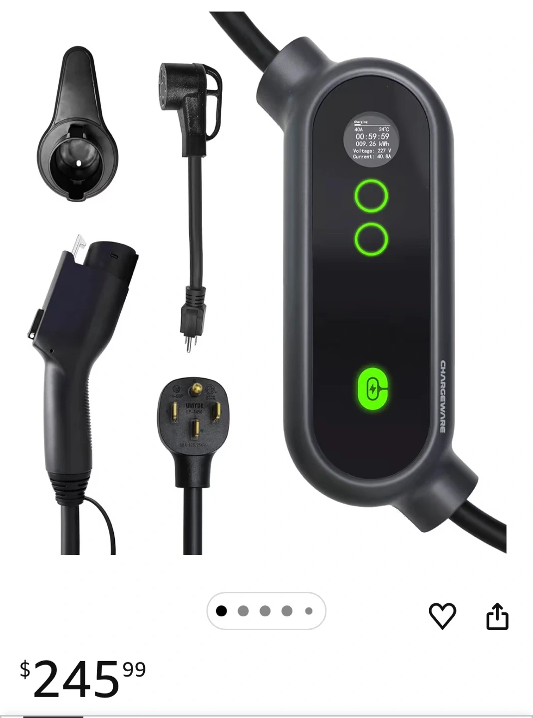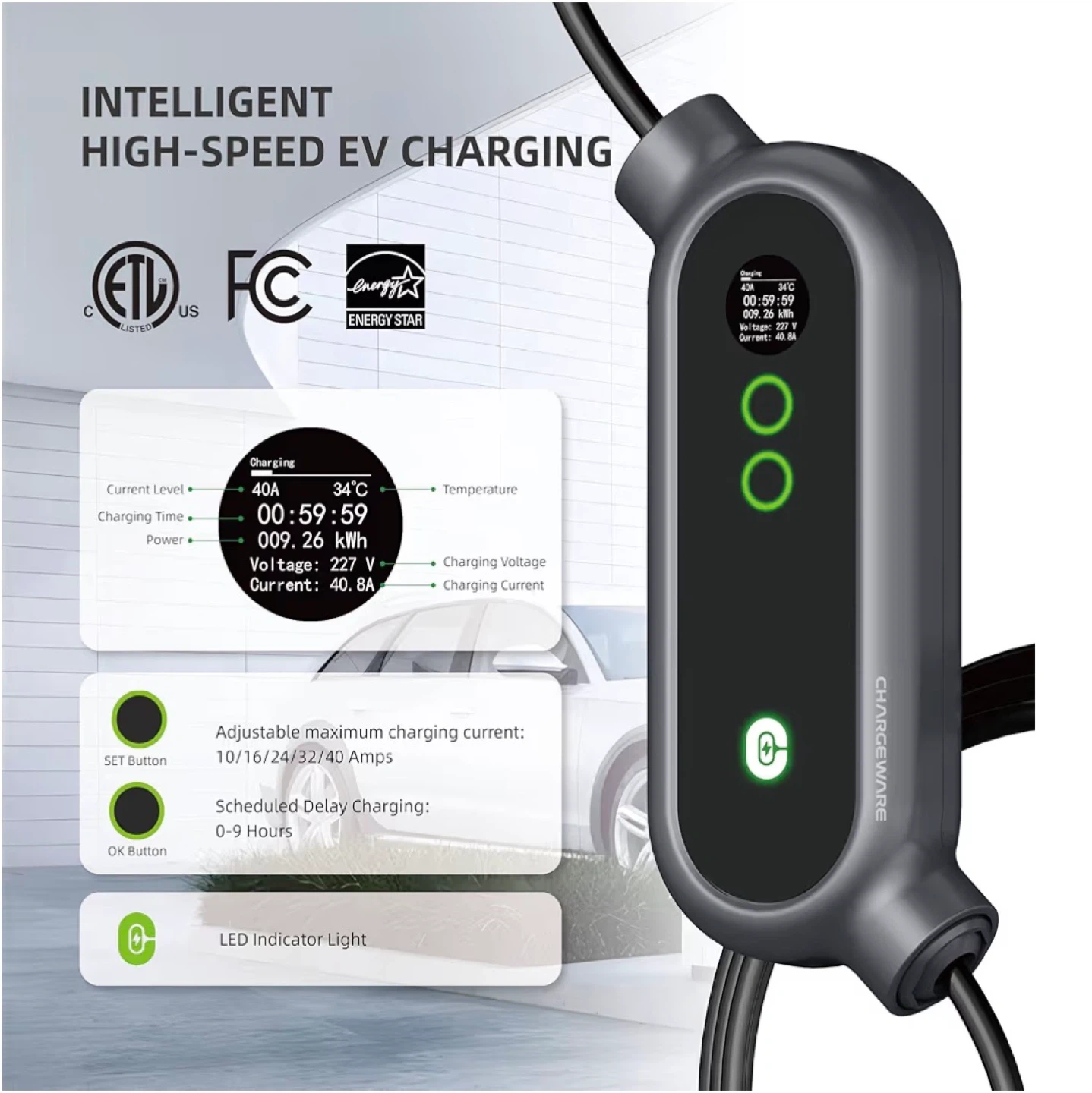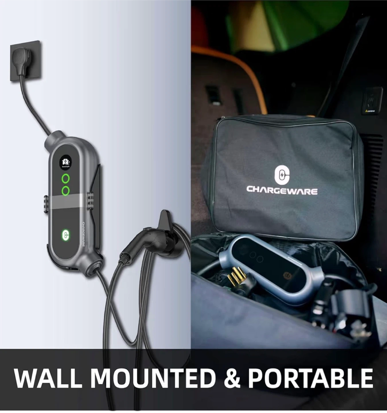 ChargeWare T Series Level 2 EV charger in white. It comes with the charger, wall mount, and storage bag. Includes the user manual. Perfect for home EV charging!