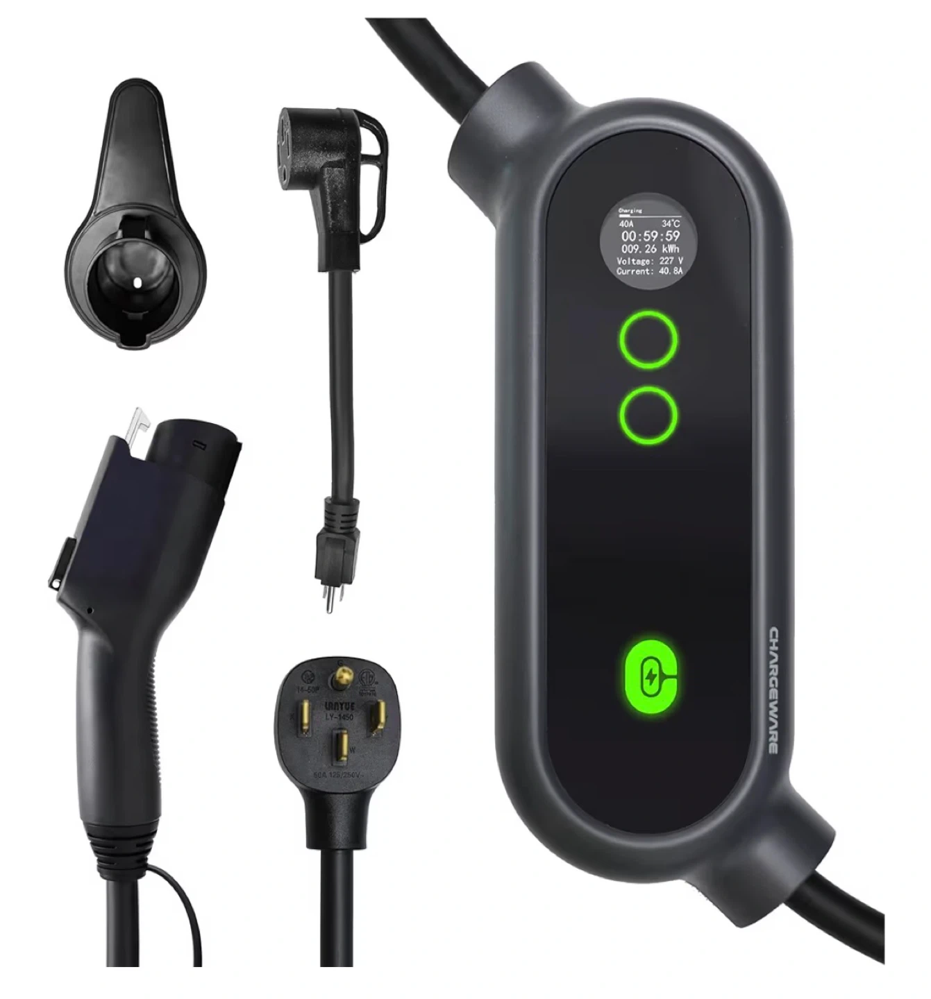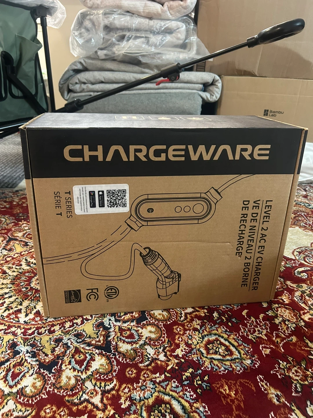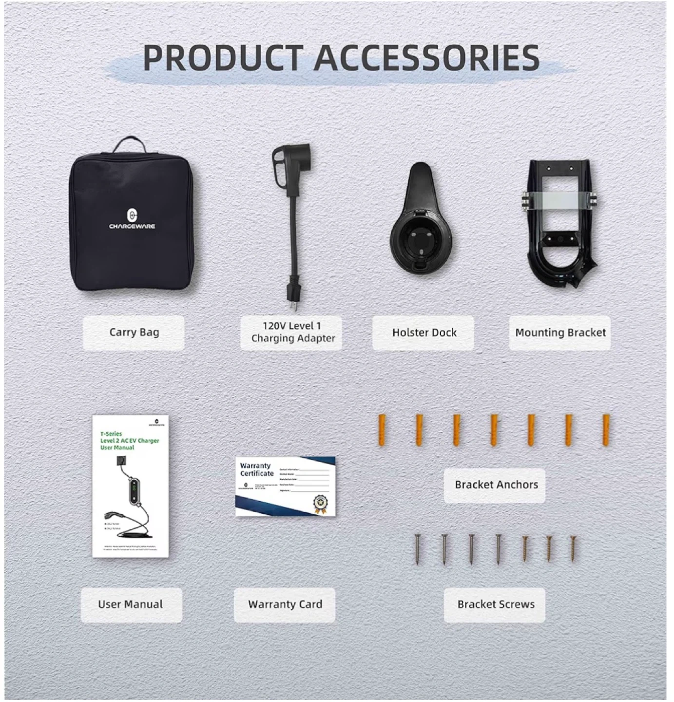 ChargeWare T Series Level 2 EV charger in white. It comes with the charger, wall mount, and storage bag. Includes the user manual. Perfect for home EV charging!