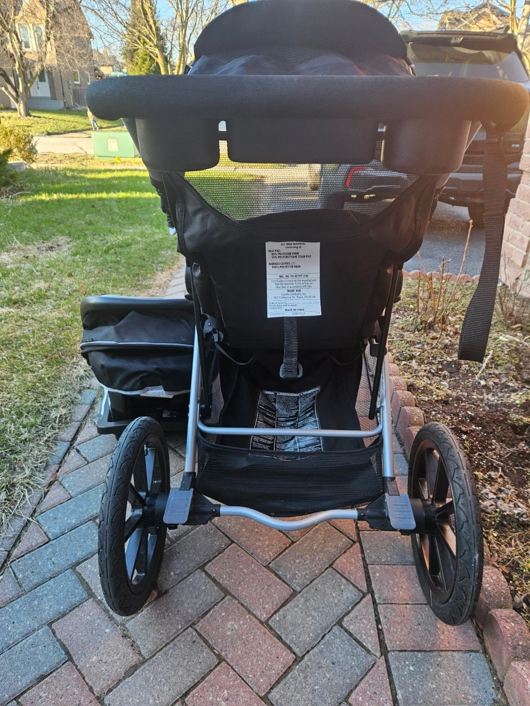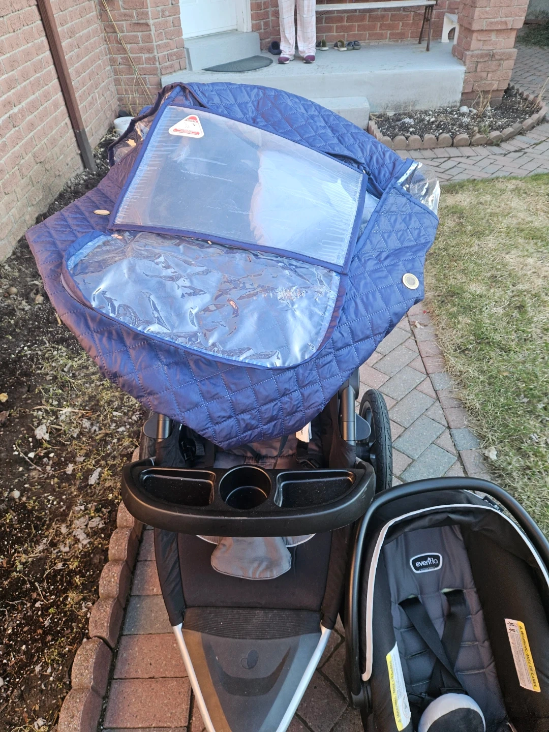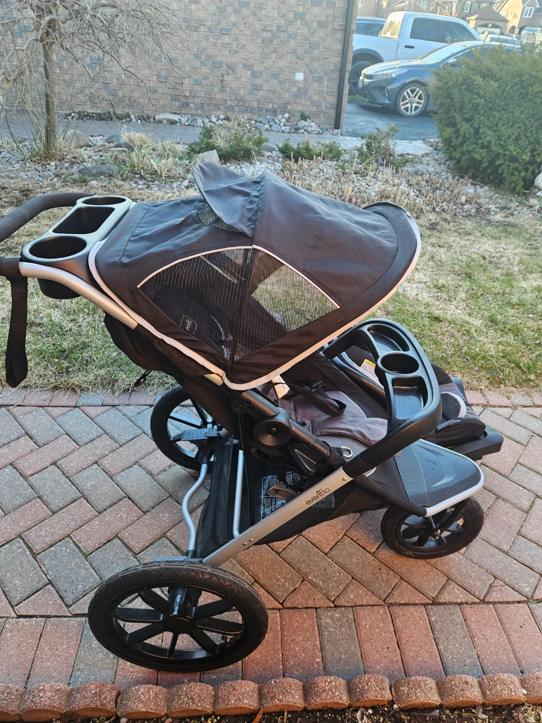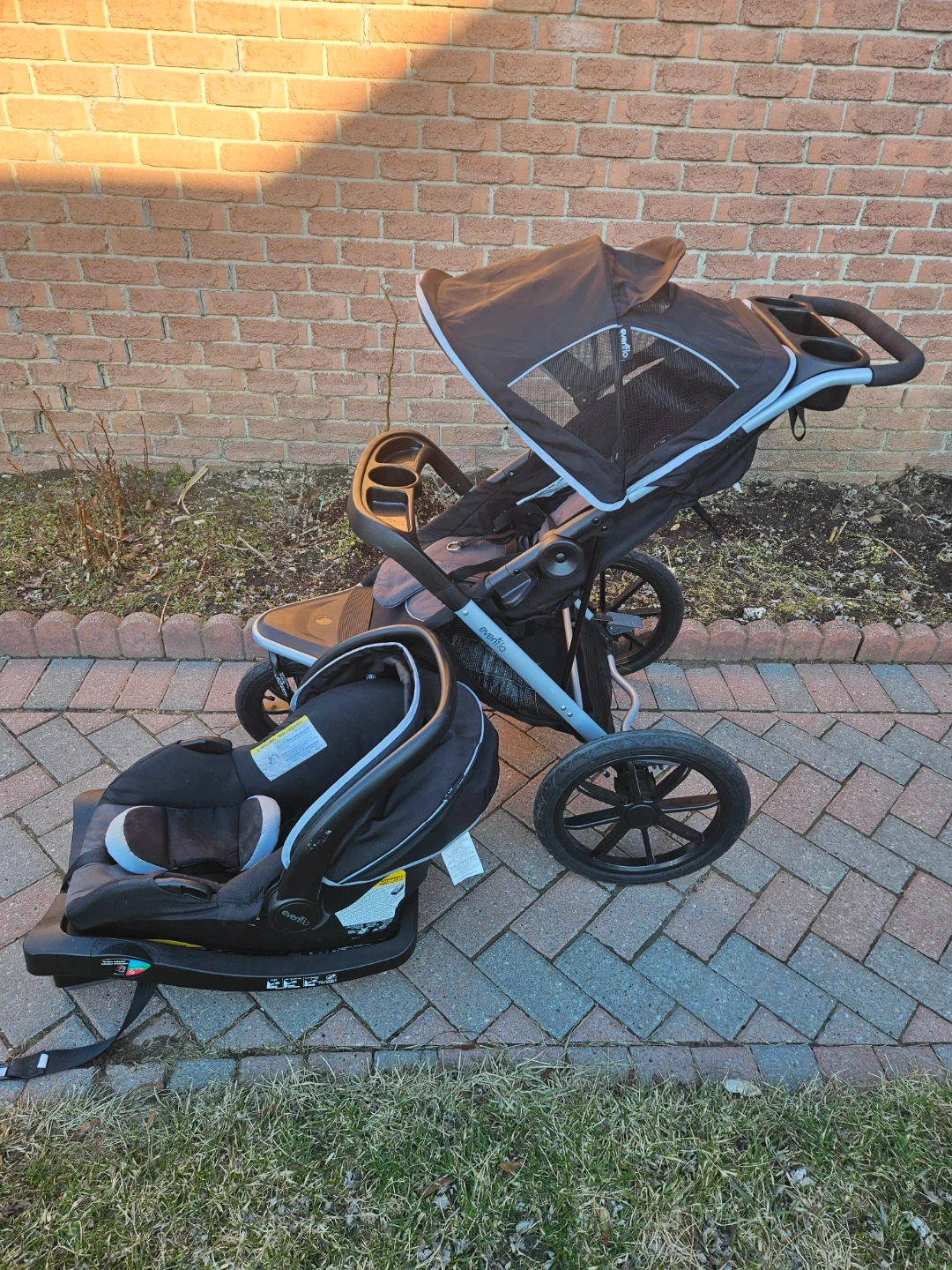 This Evenflo stroller and car seat travel system is black and grey. It includes a stroller with a canopy and a car seat with a base. The stroller has a cup holder and a snack tray.