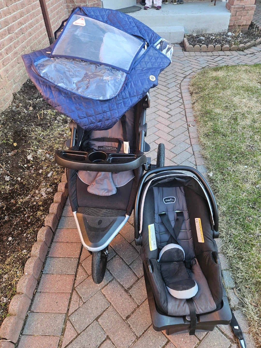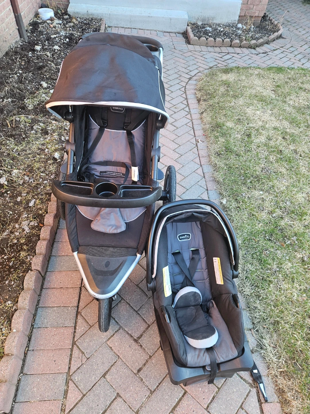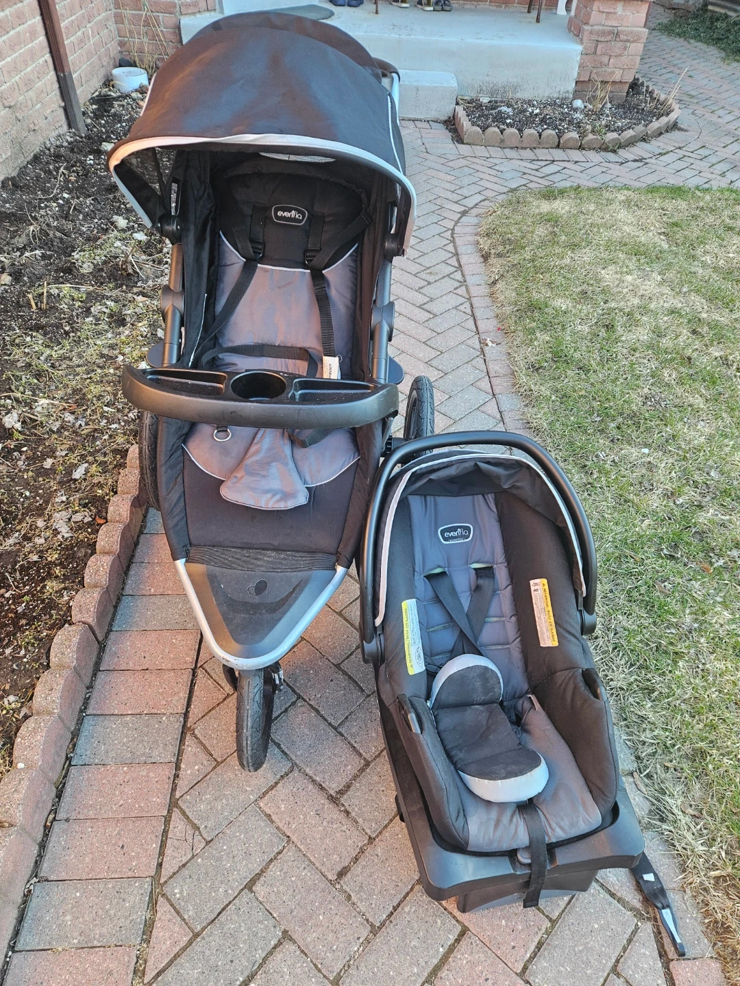 This Evenflo stroller and car seat travel system is black and grey. It includes a stroller with a canopy and a car seat with a base. The stroller has a cup holder and a snack tray.