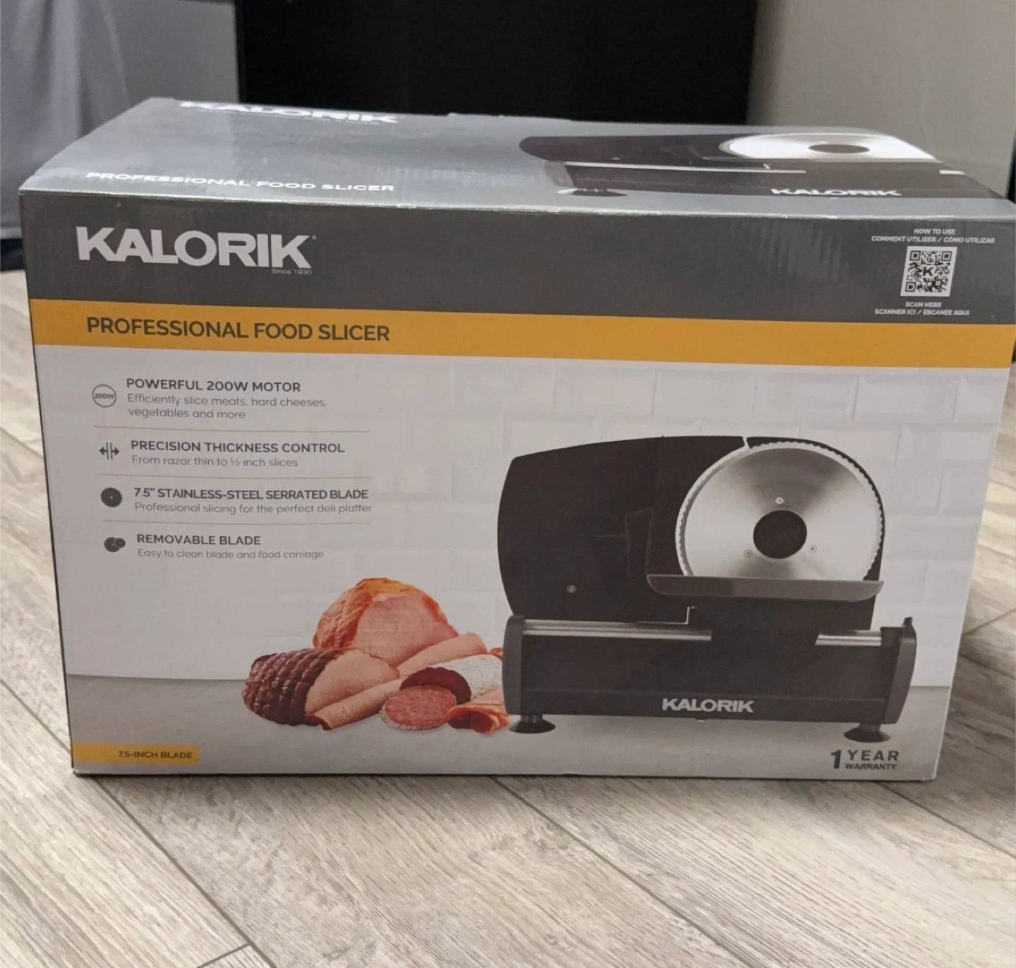 This Kalorik professional food slicer has a powerful 200W motor and a 7.5-inch stainless-steel serrated blade. It offers precision thickness control for slices from razor thin to ½ inch. The blade is removable for easy cleaning.