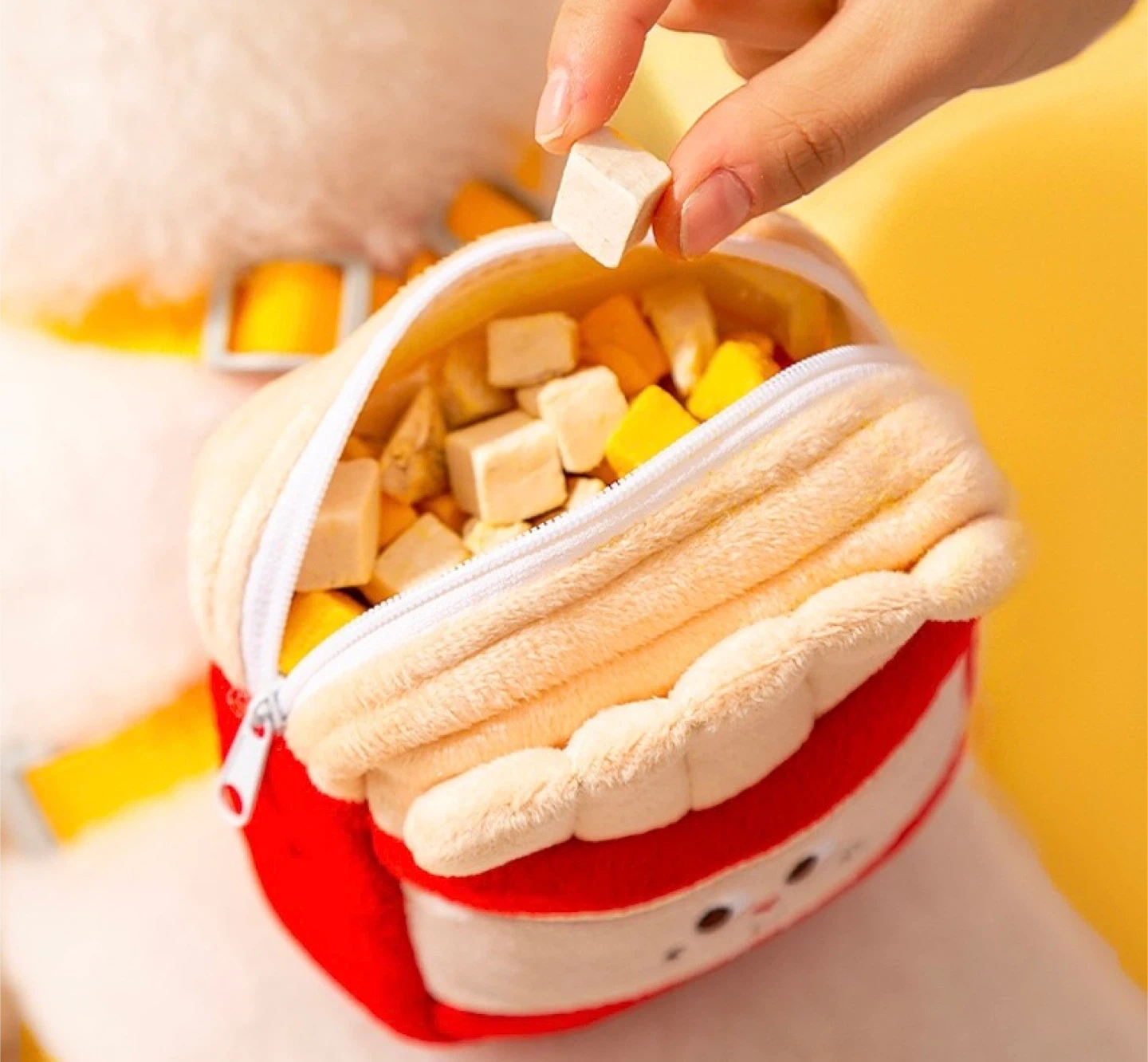 Check out these adorable plushie pouches! There's a KFC-themed lunch bag and some cute food-shaped pouches, including fries and a burger. Perfect for carrying small items or just for fun