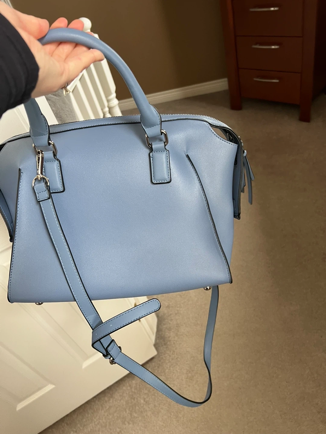This is a chic Mia & Luca handbag in a lovely blue hue. It features a zip-top closure and an optional shoulder strap. This bag is made from a smooth, durable material.