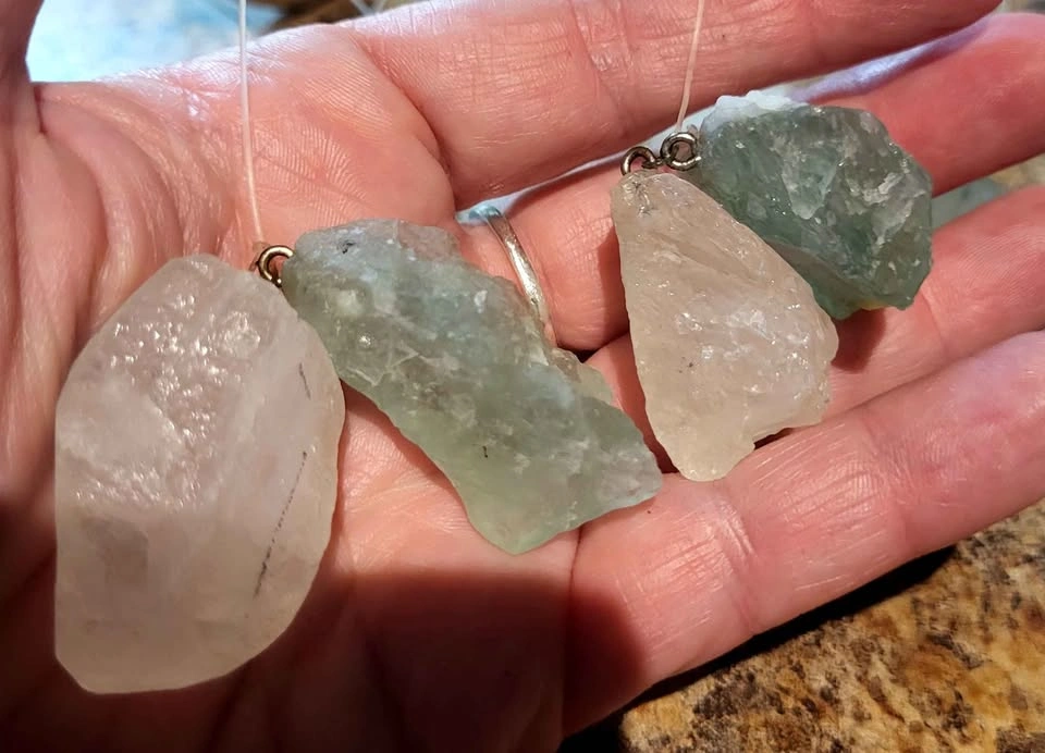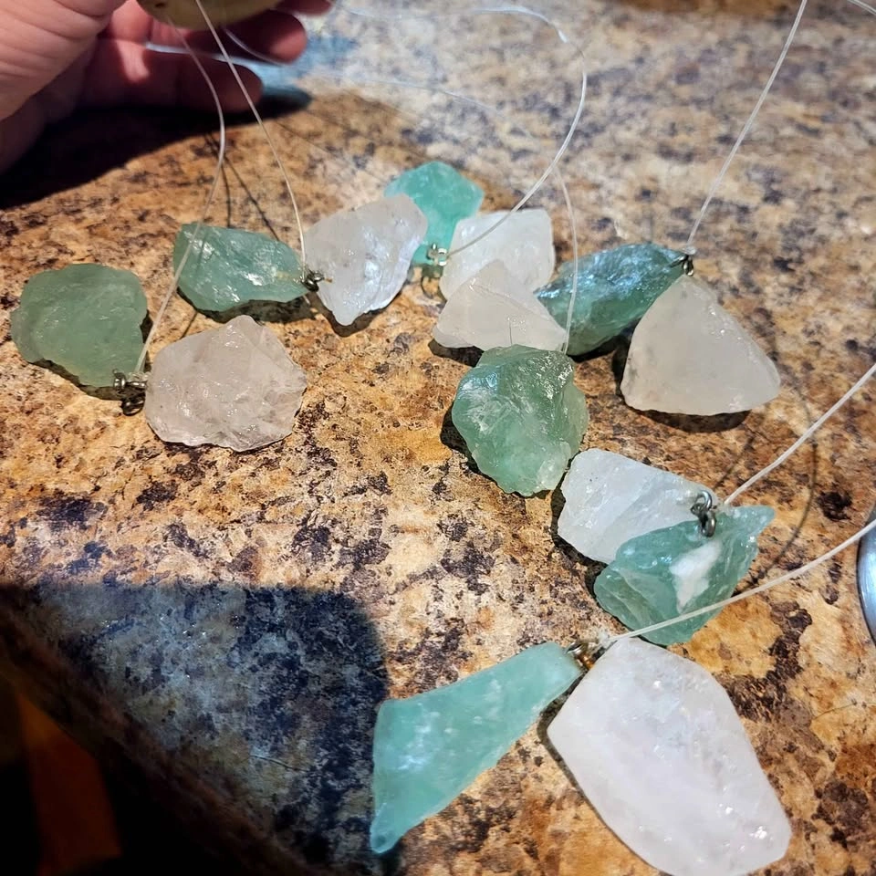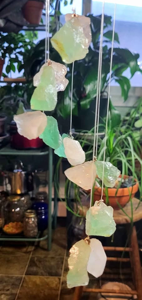 Pretty natural chunks of big green Fluorite and clear Quartz in a wind chime...14 Natural chunks they look gorgeous in the sunlight. These are not polished pieces, they are natural.