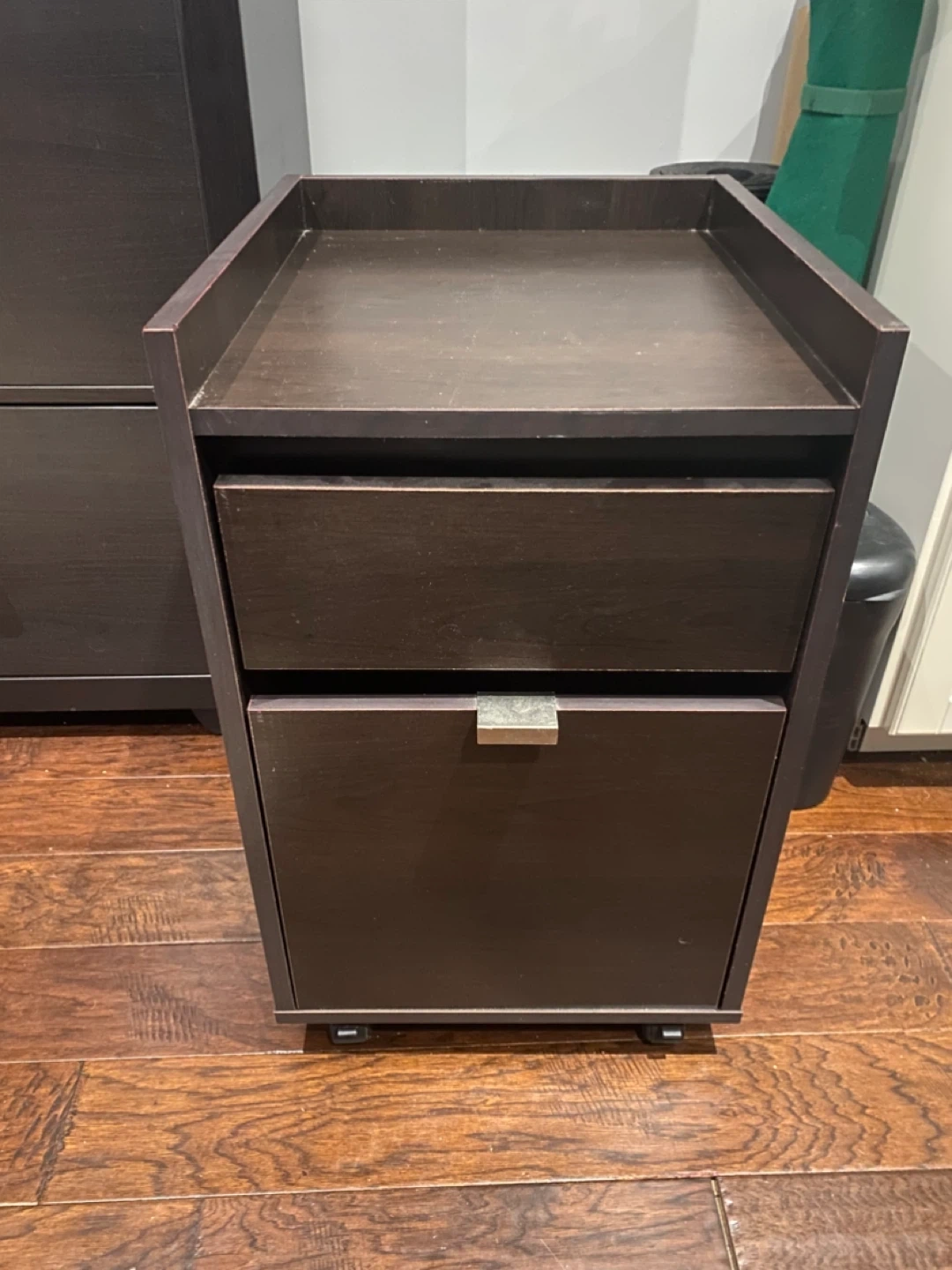 This is a dark brown rolling file cabinet. It has one drawer on top and a larger cabinet space below. The casters make it easy to move around your workspace. It's great for storing documents or office supplies! Measures 25-3/8”h x 15-3/8”w x 17-3/3”d. Pick up at Weston and Eglinton.