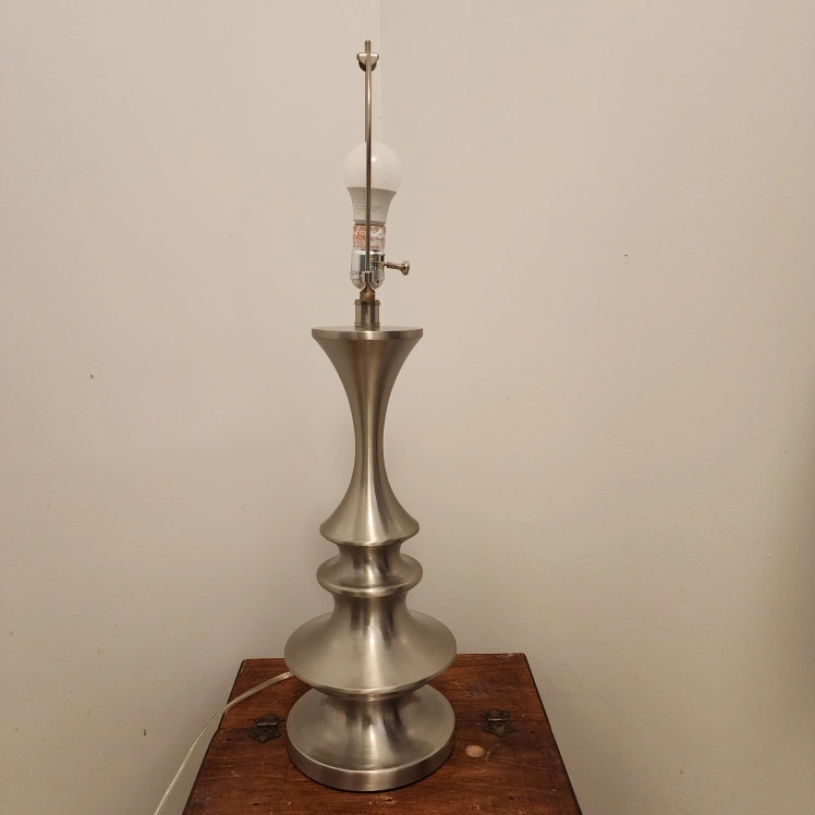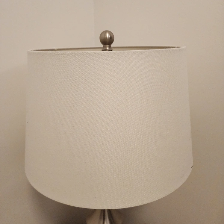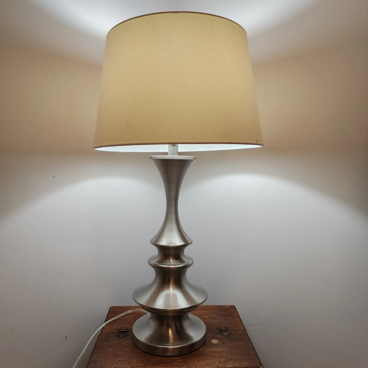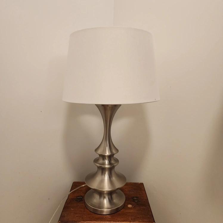 STAINLESS STEEL TABLE LAMP WITH WHITE SHADE EUC