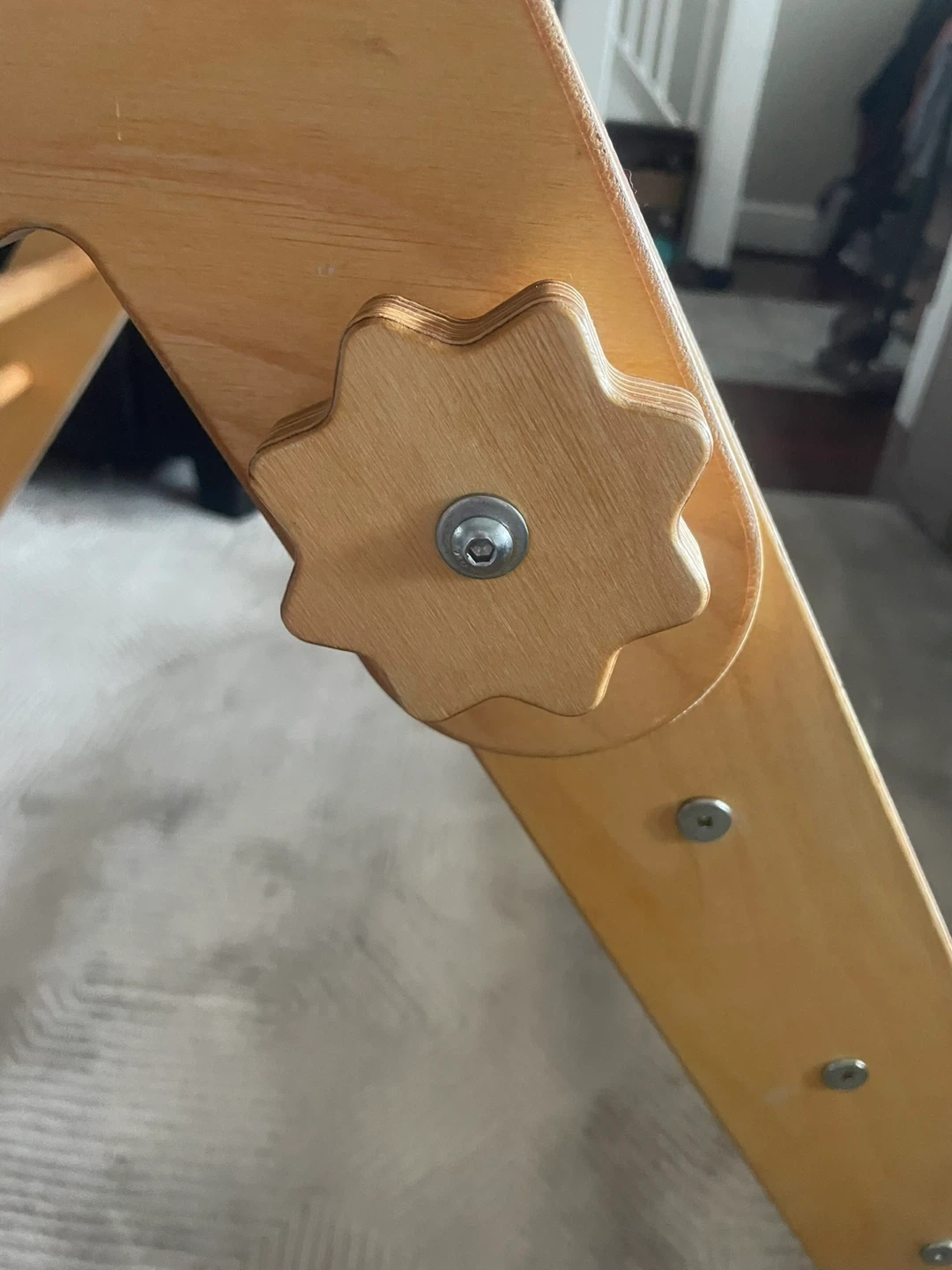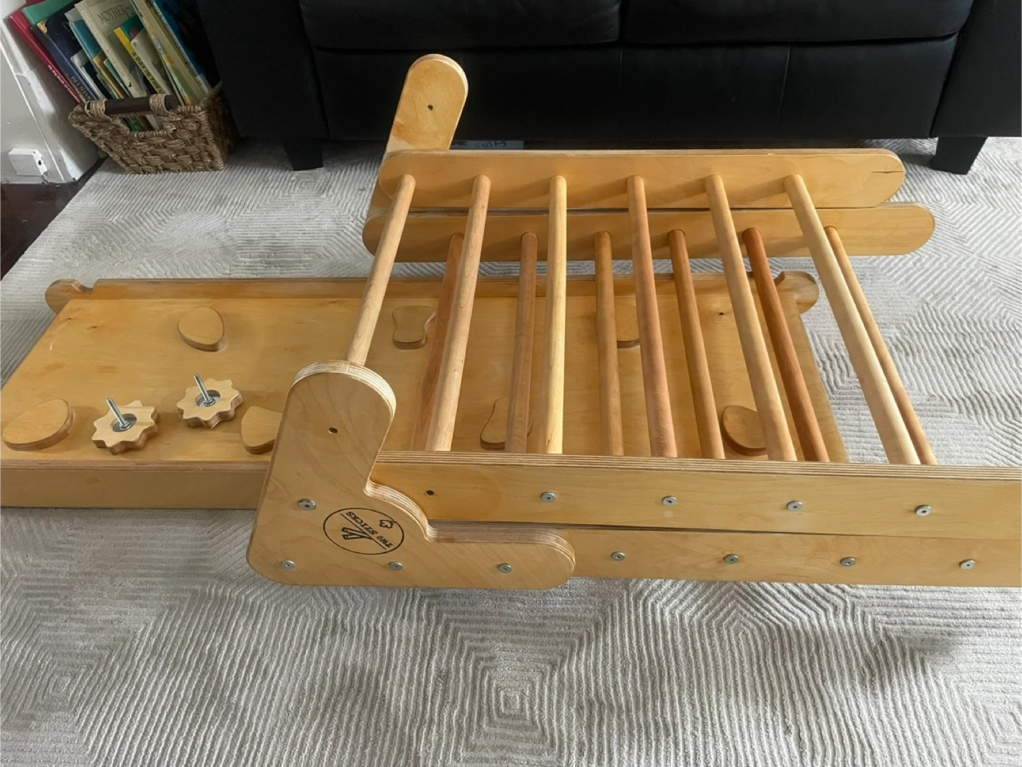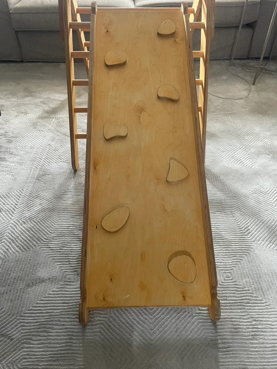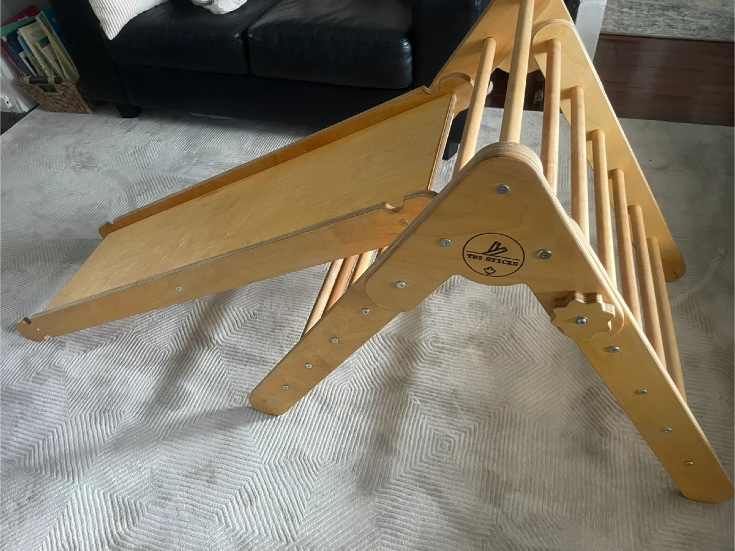 A Two Sticks wooden climbing triangle and ramp set made from natural wood. This climbing structure is great for developing gross motor skills. It folds for easier storage. Includes adjustable knobs and climbing holds.