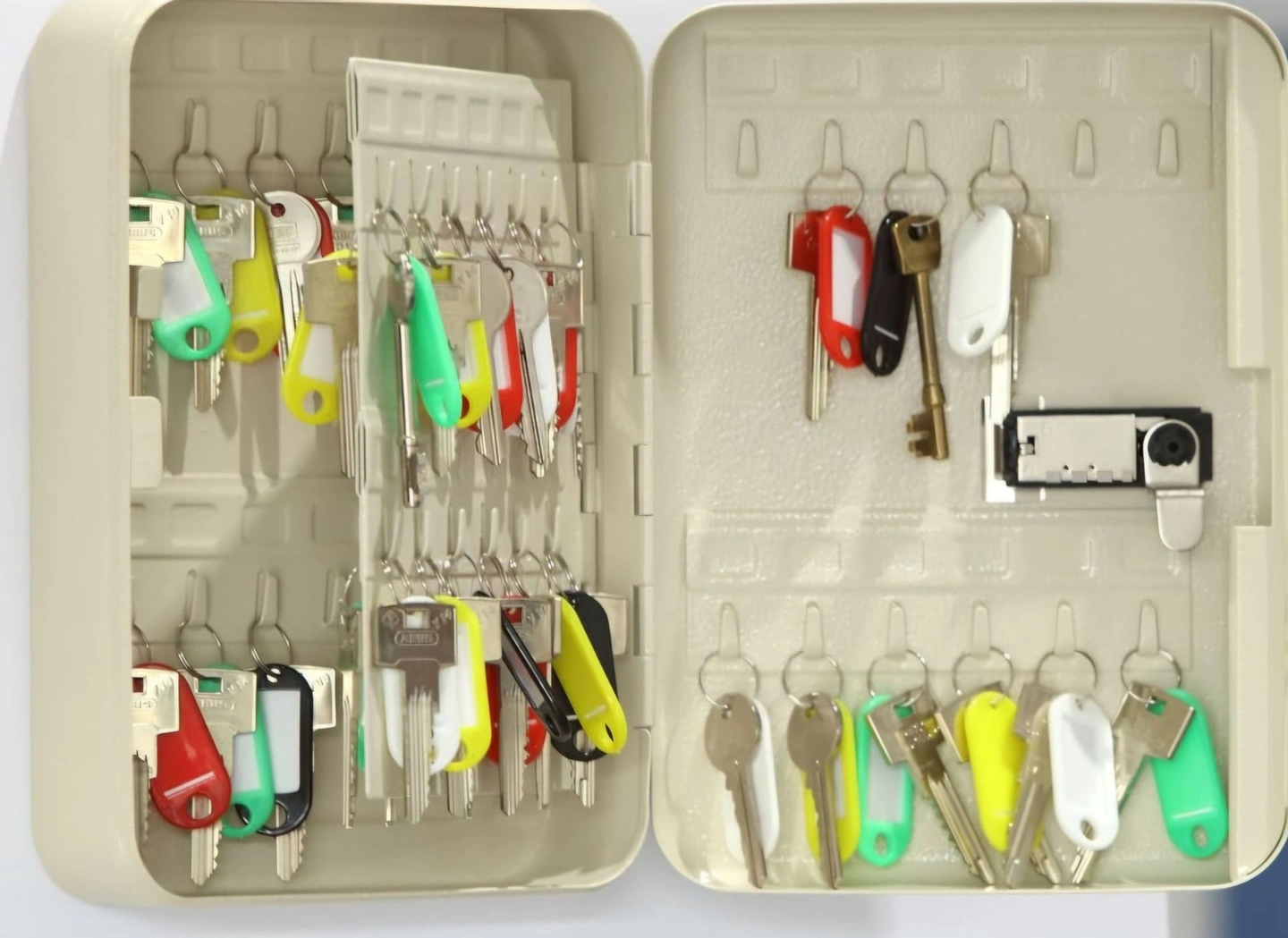 This is a cream-colored key cabinet with a 48-key capacity, secured by a combination lock. It's great for organizing and storing keys securely. Feel free to message me if you have any questions!