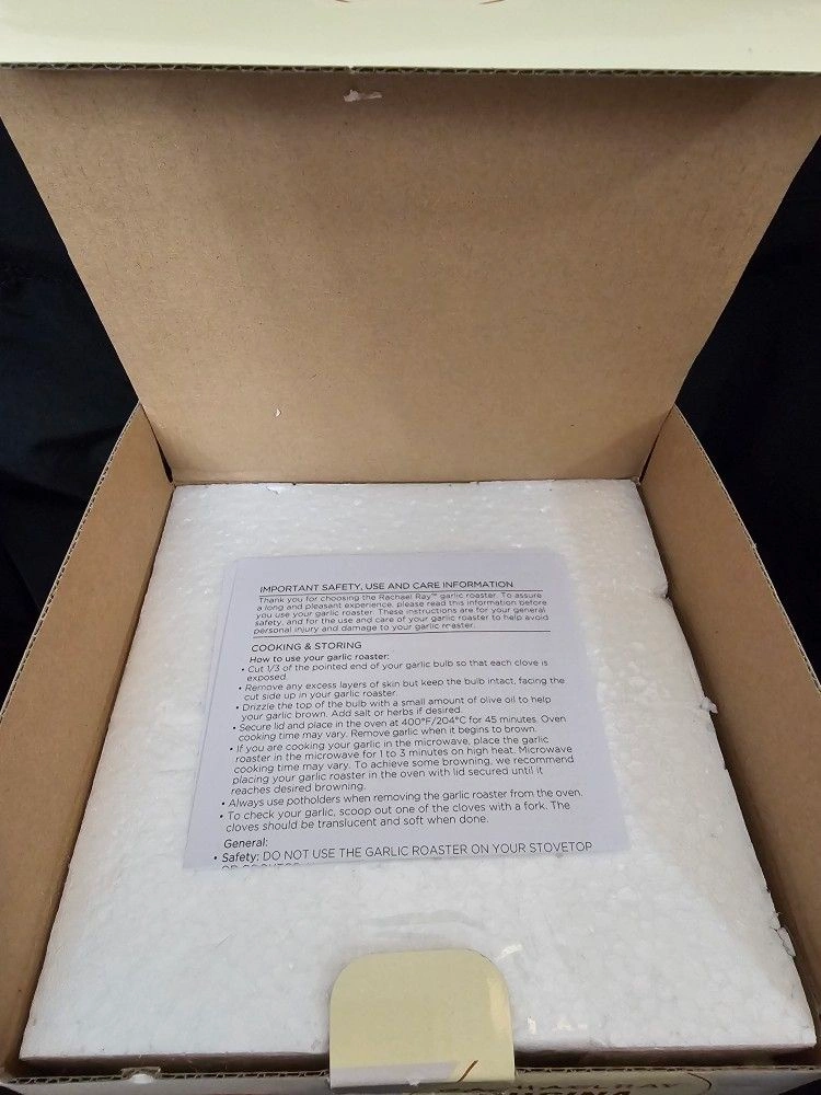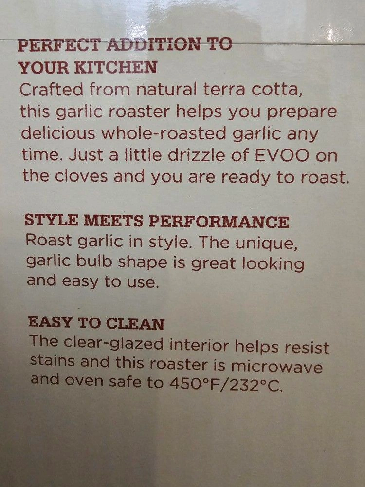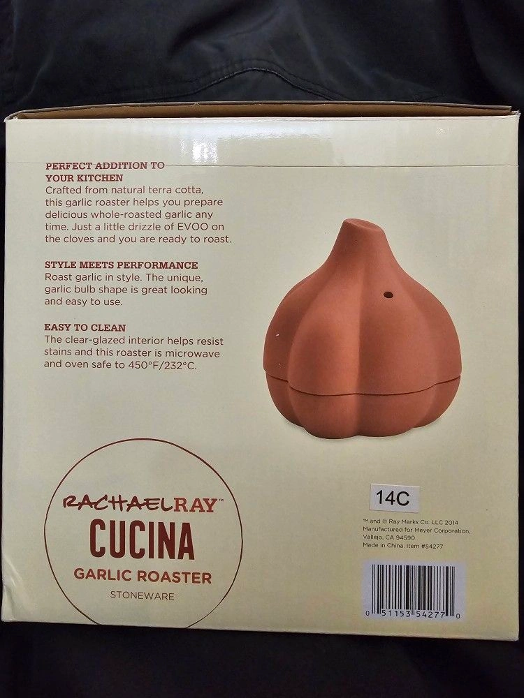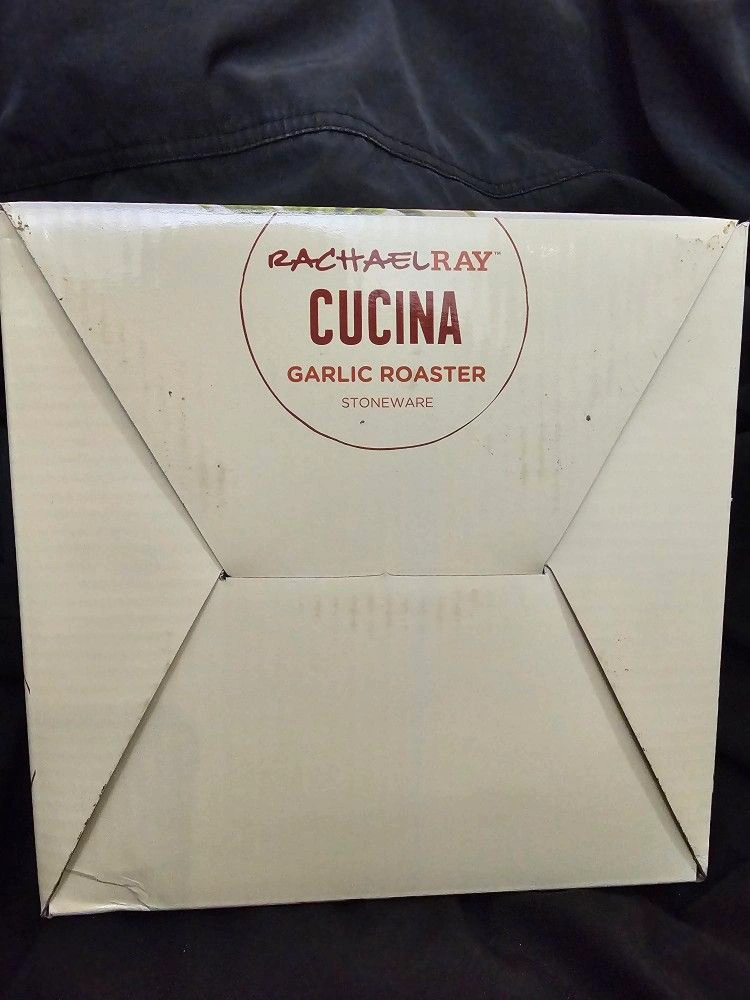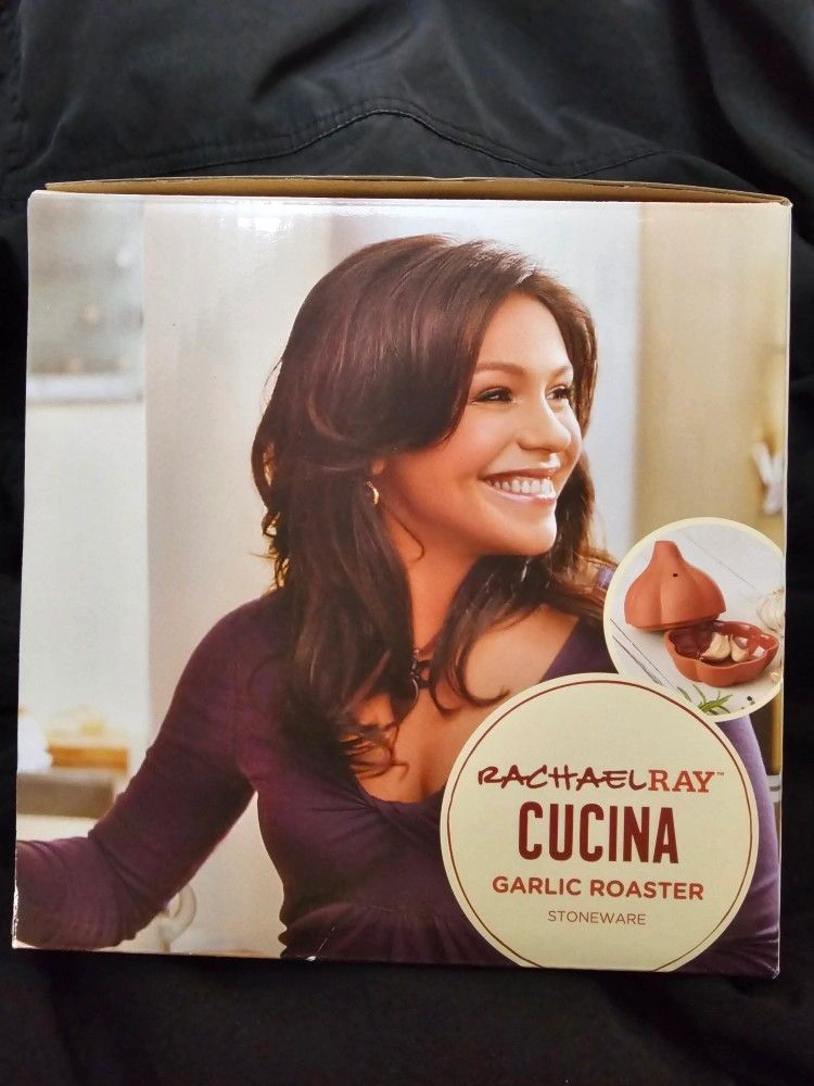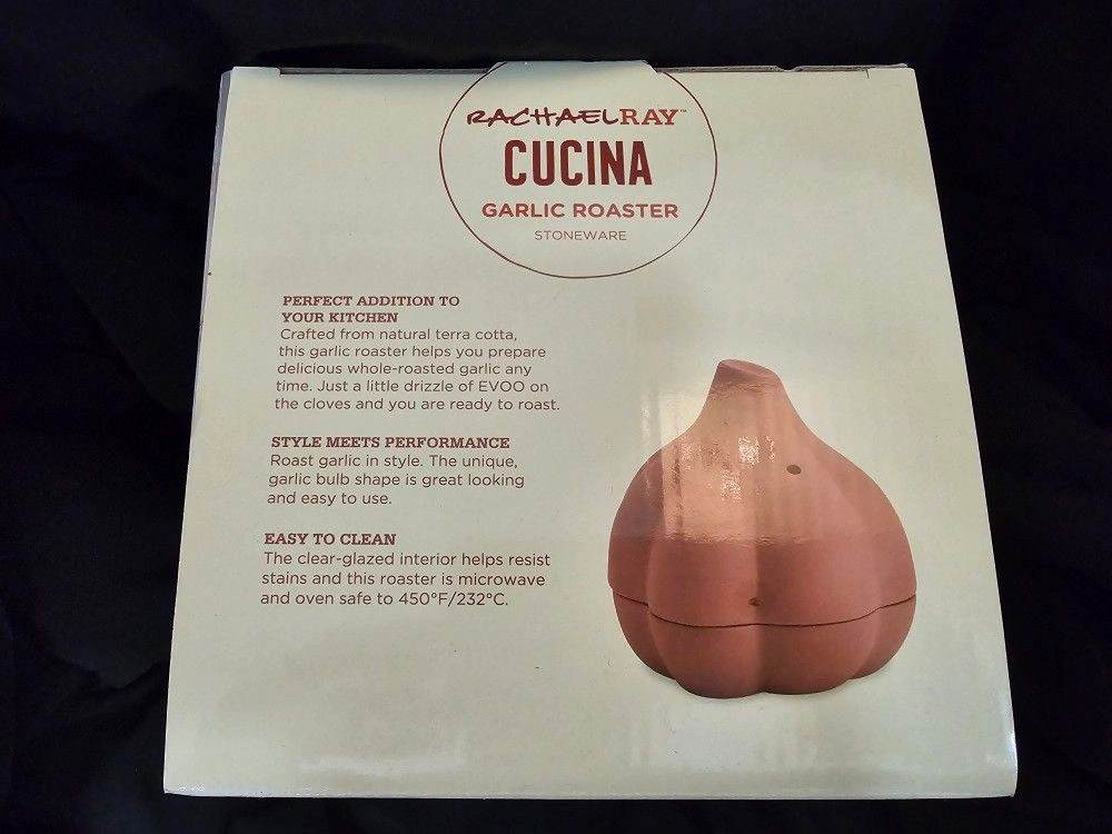 BRAND NEW Rachael Ray Cucina Garlic Roaster. Crafted from Natural Terra Cotta. Garlic Bulb Shape. NEVER USED OR TAKING OUT OF THE BOX. Color: Terra Cotta. Material: StoneWare. Let me know if you're interested!