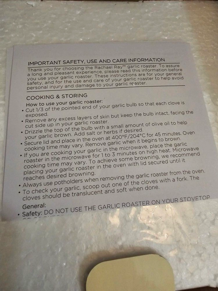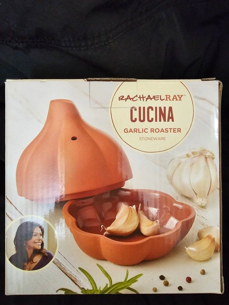 BRAND NEW Rachael Ray Cucina Garlic Roaster. Crafted from Natural Terra Cotta. Garlic Bulb Shape. NEVER USED OR TAKING OUT OF THE BOX. Color: Terra Cotta. Material: StoneWare. Let me know if you're interested!