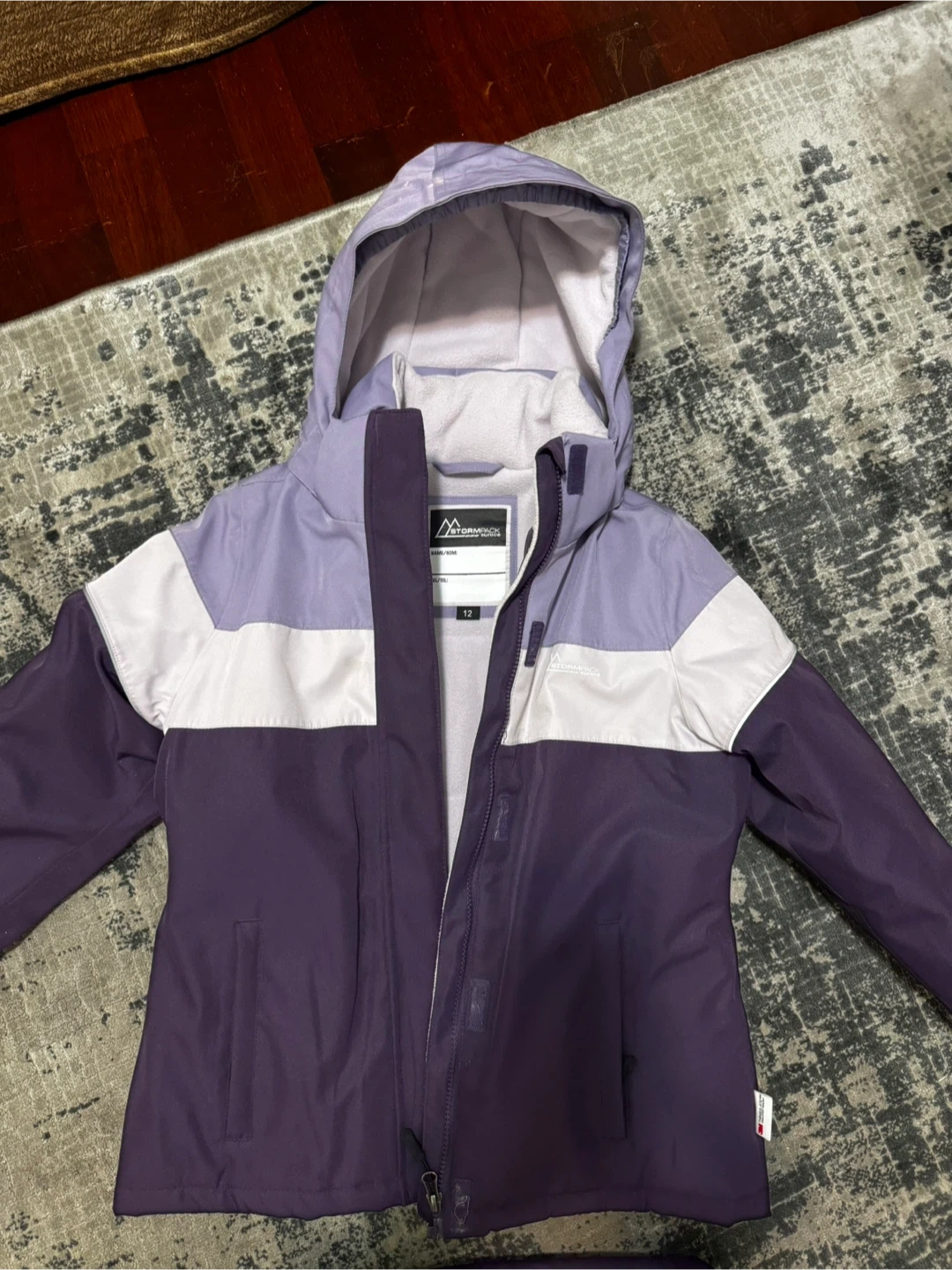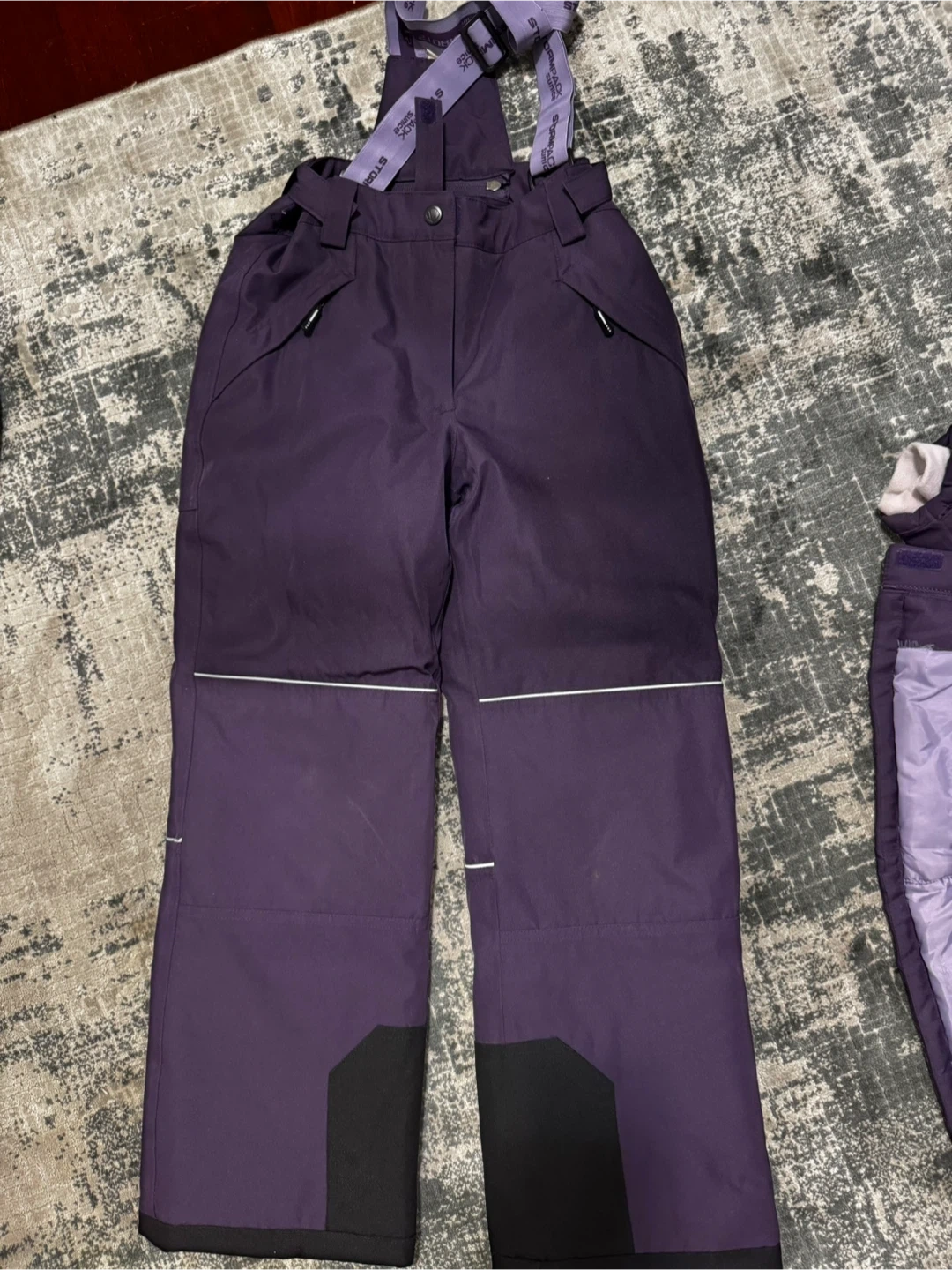 This is a two-piece purple ski suit from Stormpack. It features a hooded jacket and insulated pants with suspenders. The jacket has a fleece-lined interior and multiple pockets. The pants are also insulated for warmth. Size is 12.