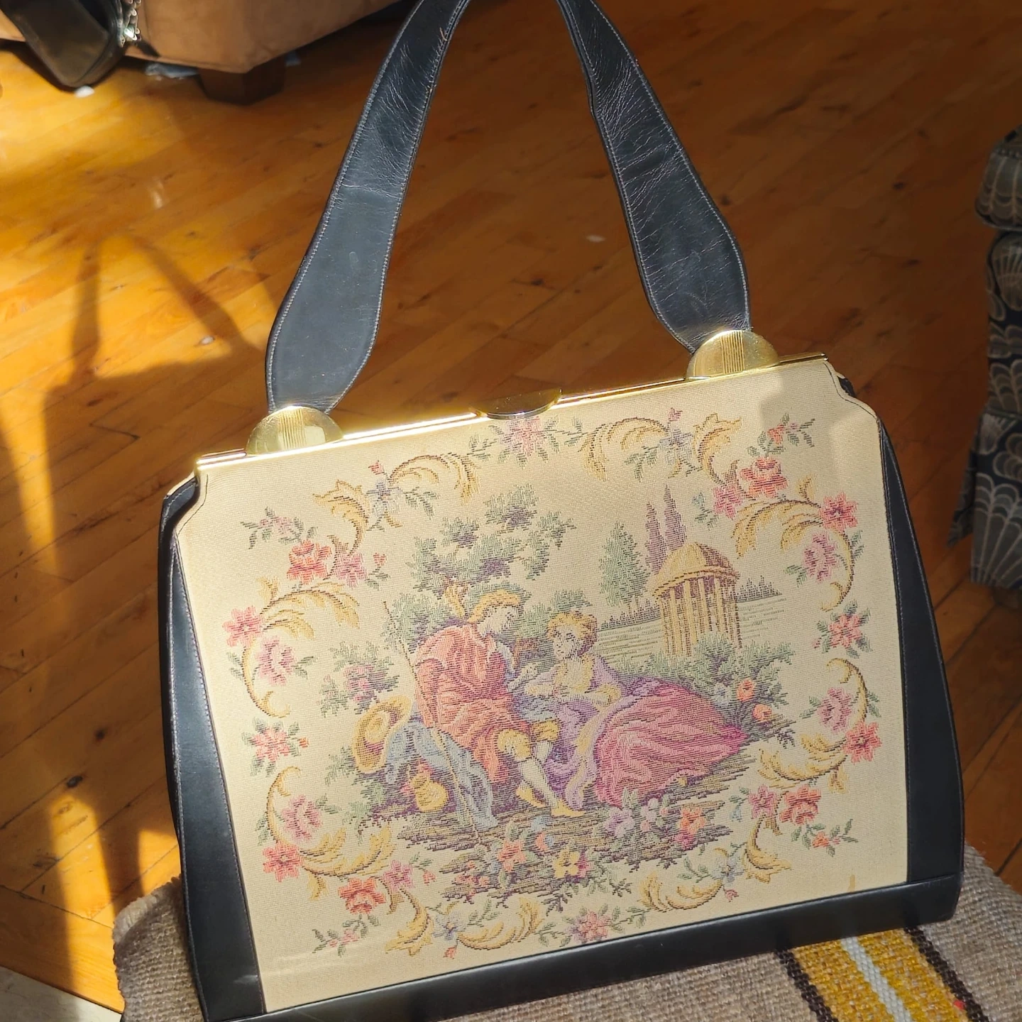 Selling a beautiful vintage Cortini handbag! It features a lovely tapestry design on the front and black leather straps. A unique piece to add to your collection!