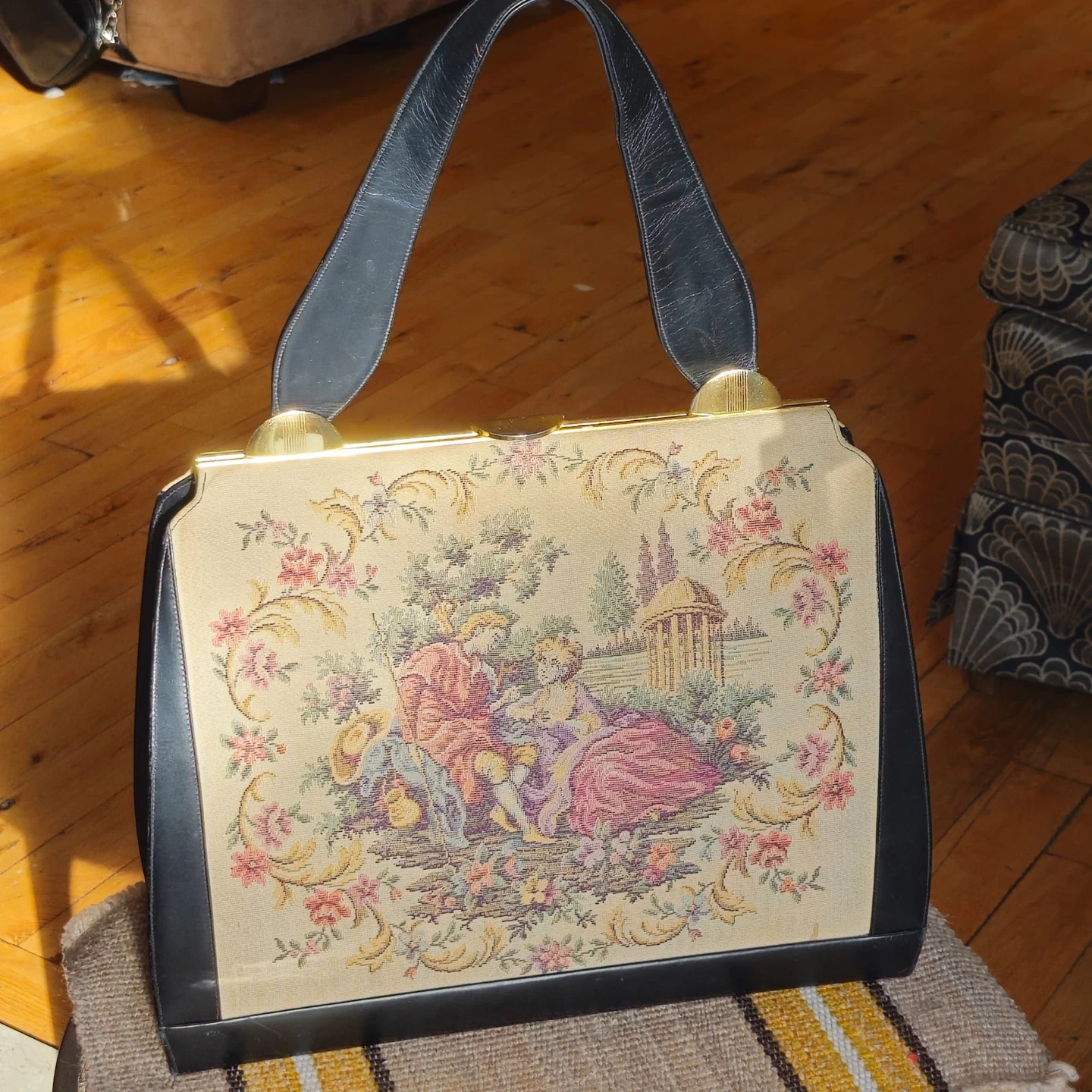 Selling a beautiful vintage Cortini handbag! It features a lovely tapestry design on the front and black leather straps. A unique piece to add to your collection!