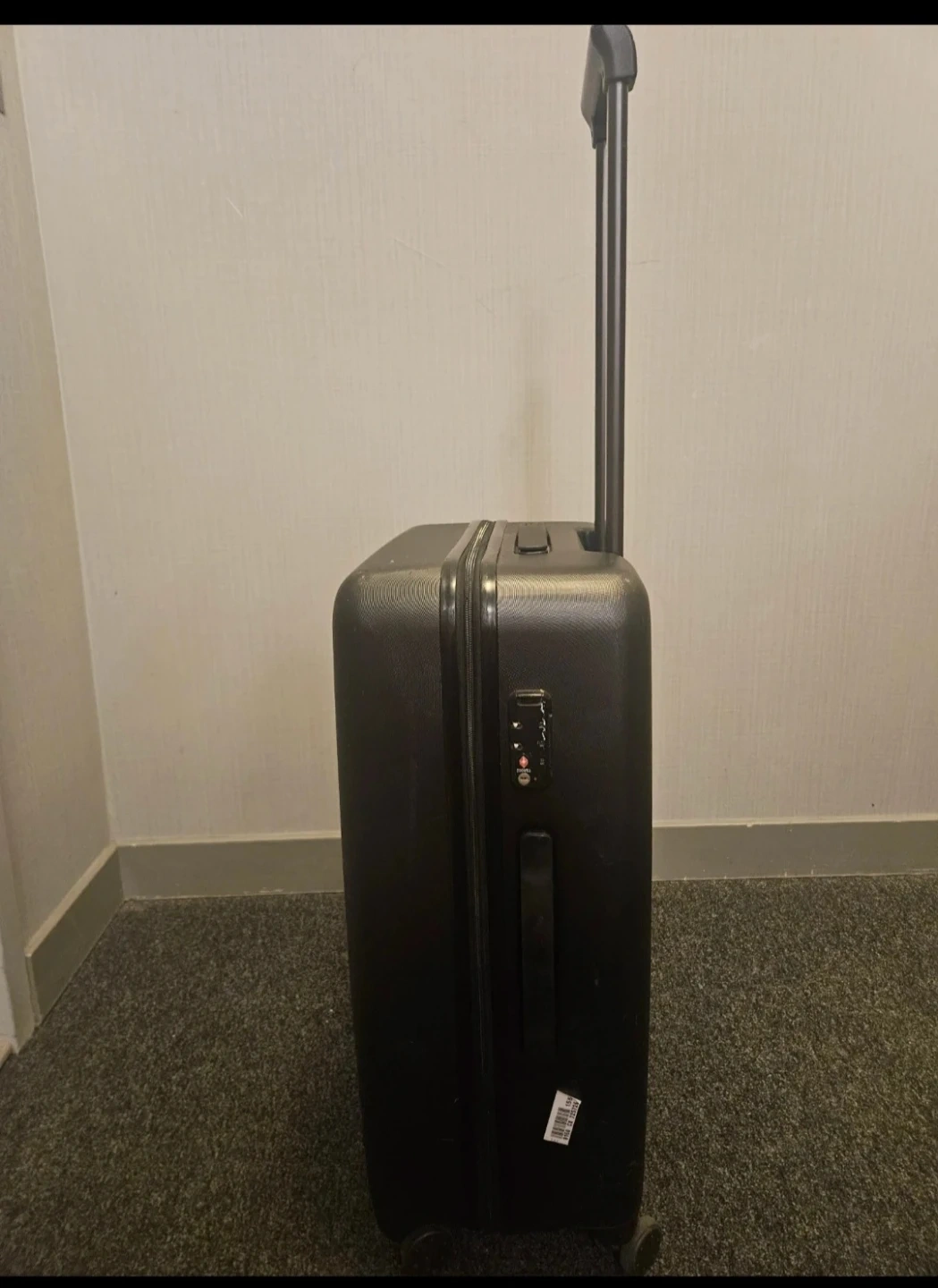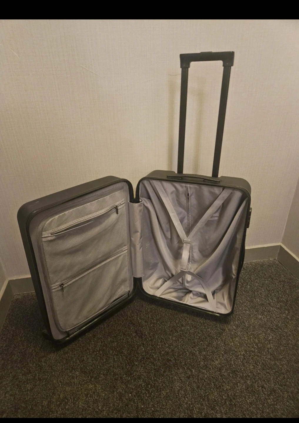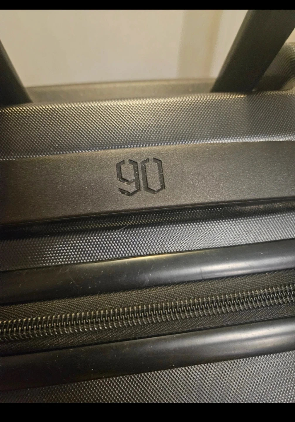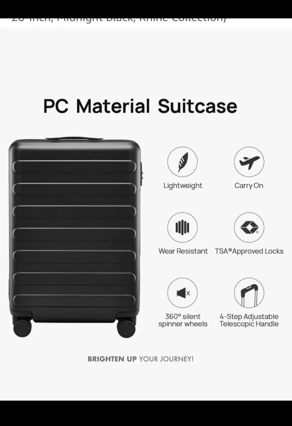 Black Xiaomi Mi 90 Point 20-inch Hardshell carry-on spinner suitcase. Midnight Black. It's lightweight and carry-on compliant. Features include 4 360° silent spinner wheels and a 4-step adjustable telescopic handle. TSA-approved locks are also included for security.