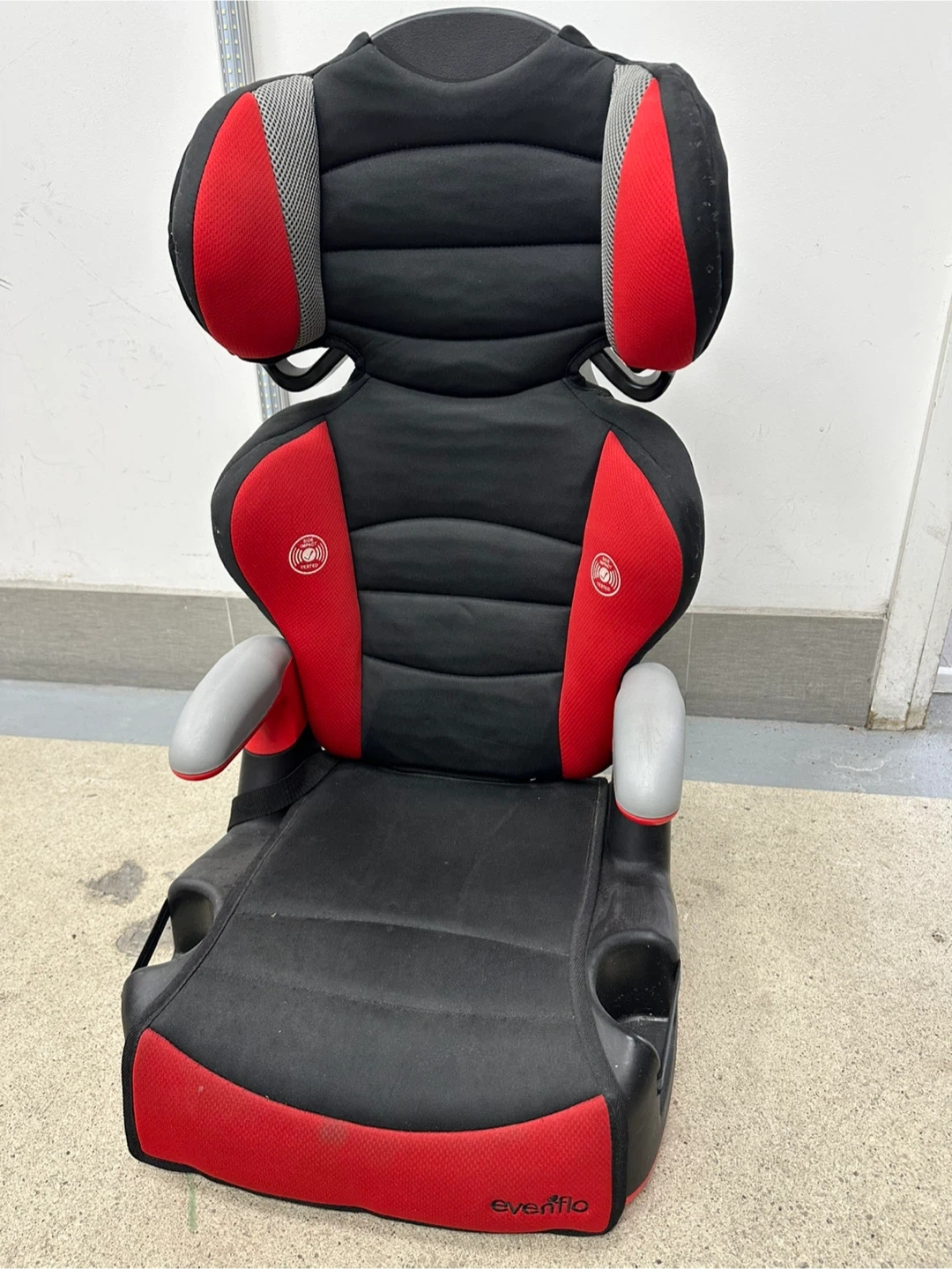 This is an Evenflo booster car seat in black and red. It features padded armrests and cup holders on the sides. This seat is designed for children who have outgrown their forward-facing car seat.