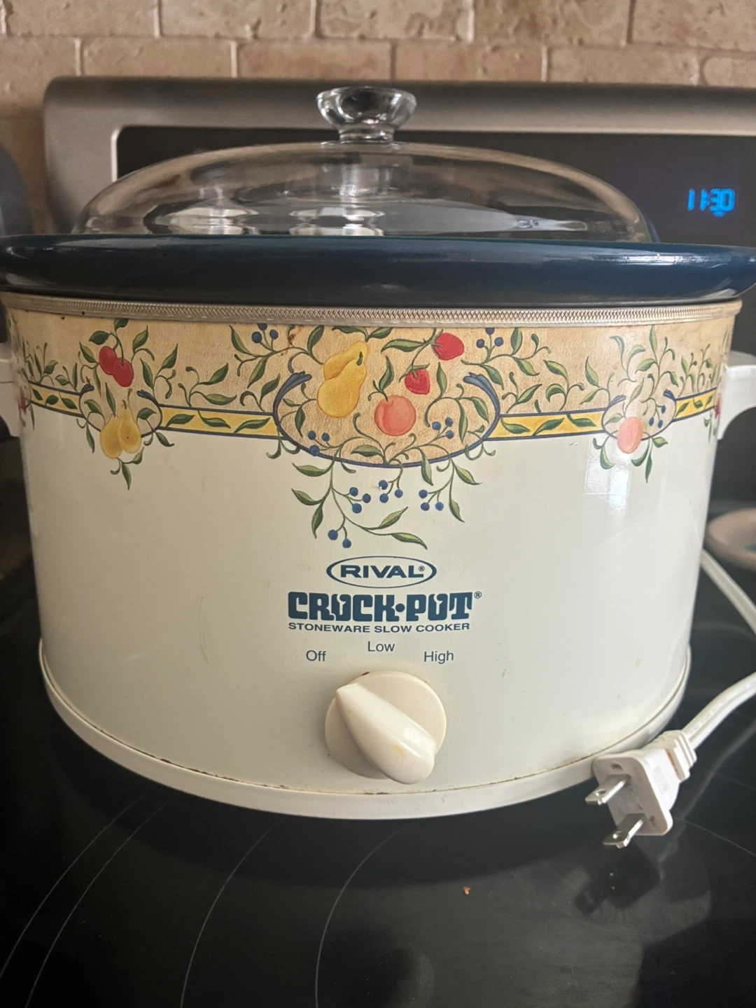This is a Rival Crock-Pot stoneware slow cooker. It has a decorative fruit and vine pattern. Settings include Off, Low, and High.