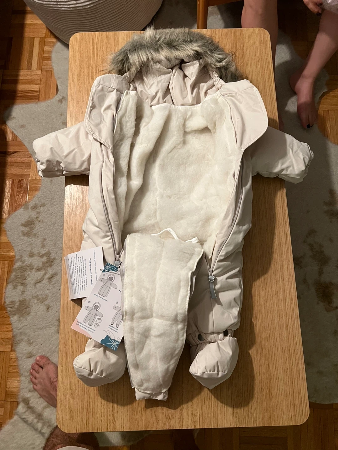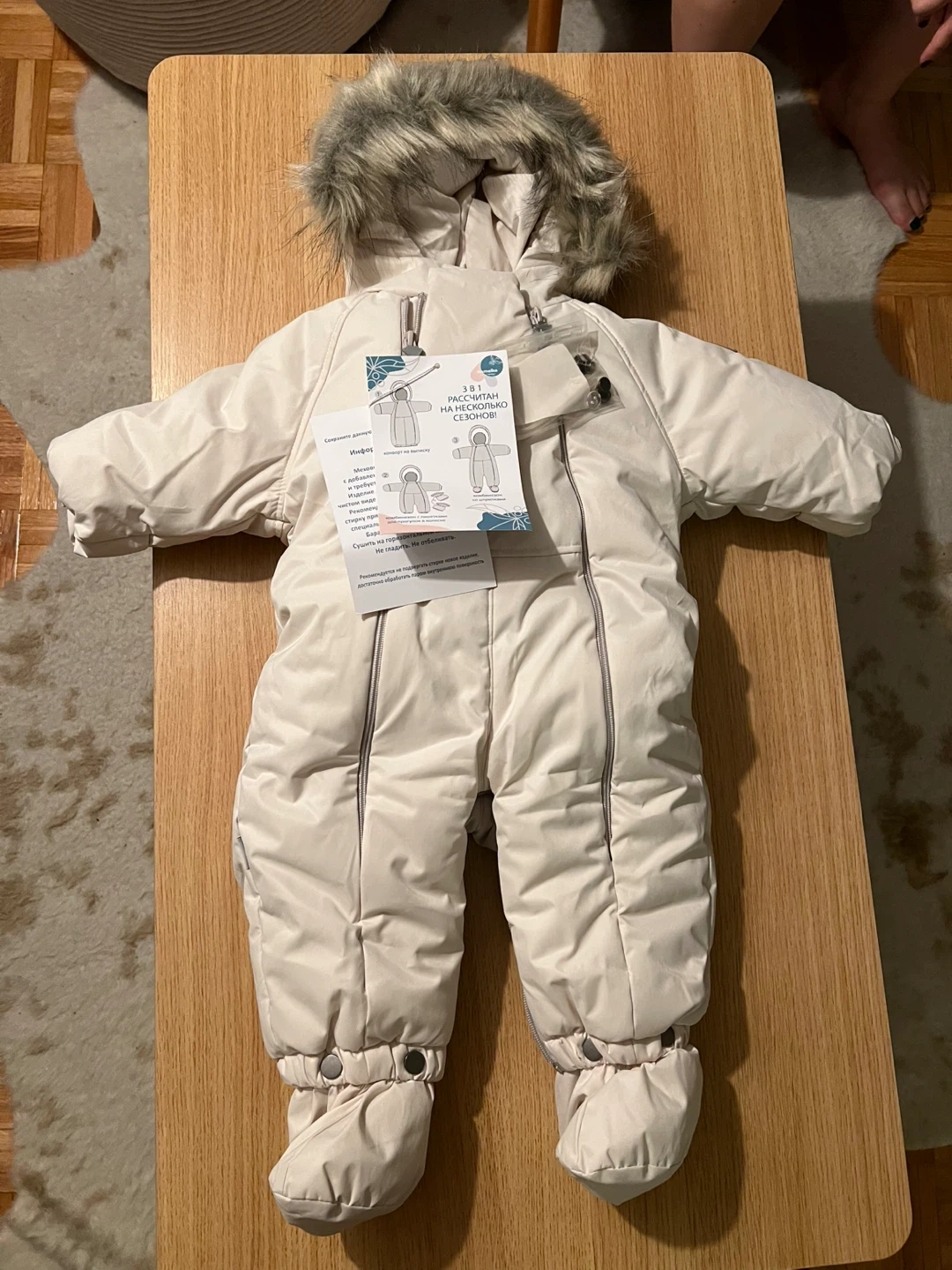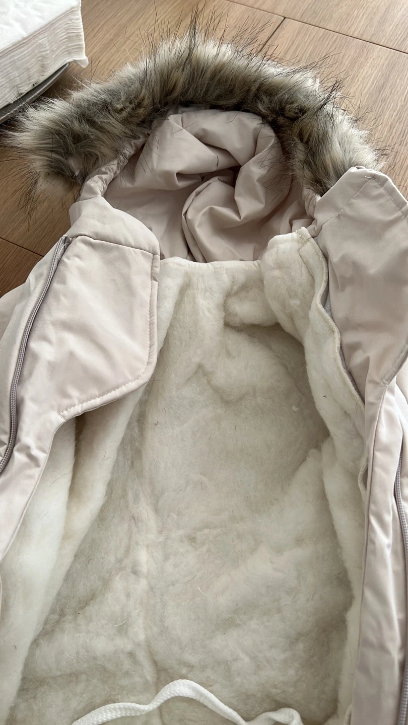 This Ramelka baby snowsuit is perfect for keeping your little one warm and cozy during the winter months! It features a faux fur hood and a soft, woolen lining that can be taken off to keep your baby comfortable. The snowsuit is new and ready for a new home
