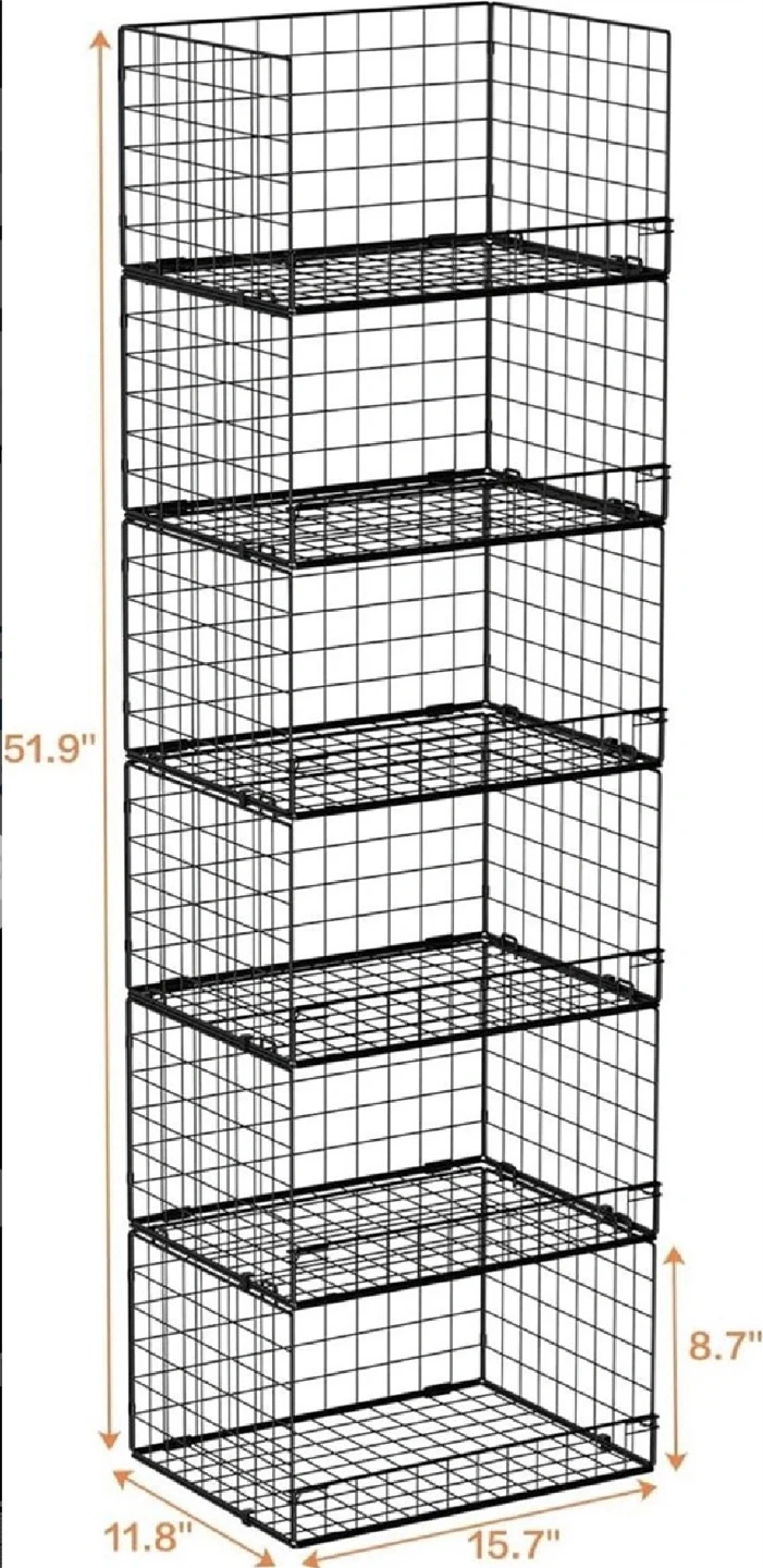 This is a 6-tier wire storage shelf unit. It's made of durable iron with a front opening and fence design. The unit is stackable and foldable for easy assembly and disassembly.