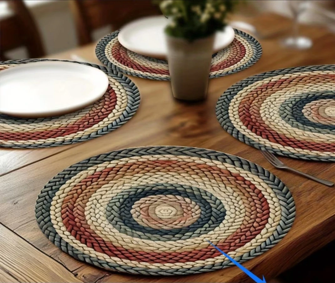 These are round placemats with a braided design. They feature a neutral colour palette with cream, beige, red, and grey tones. Perfect for everyday use or special occasions!