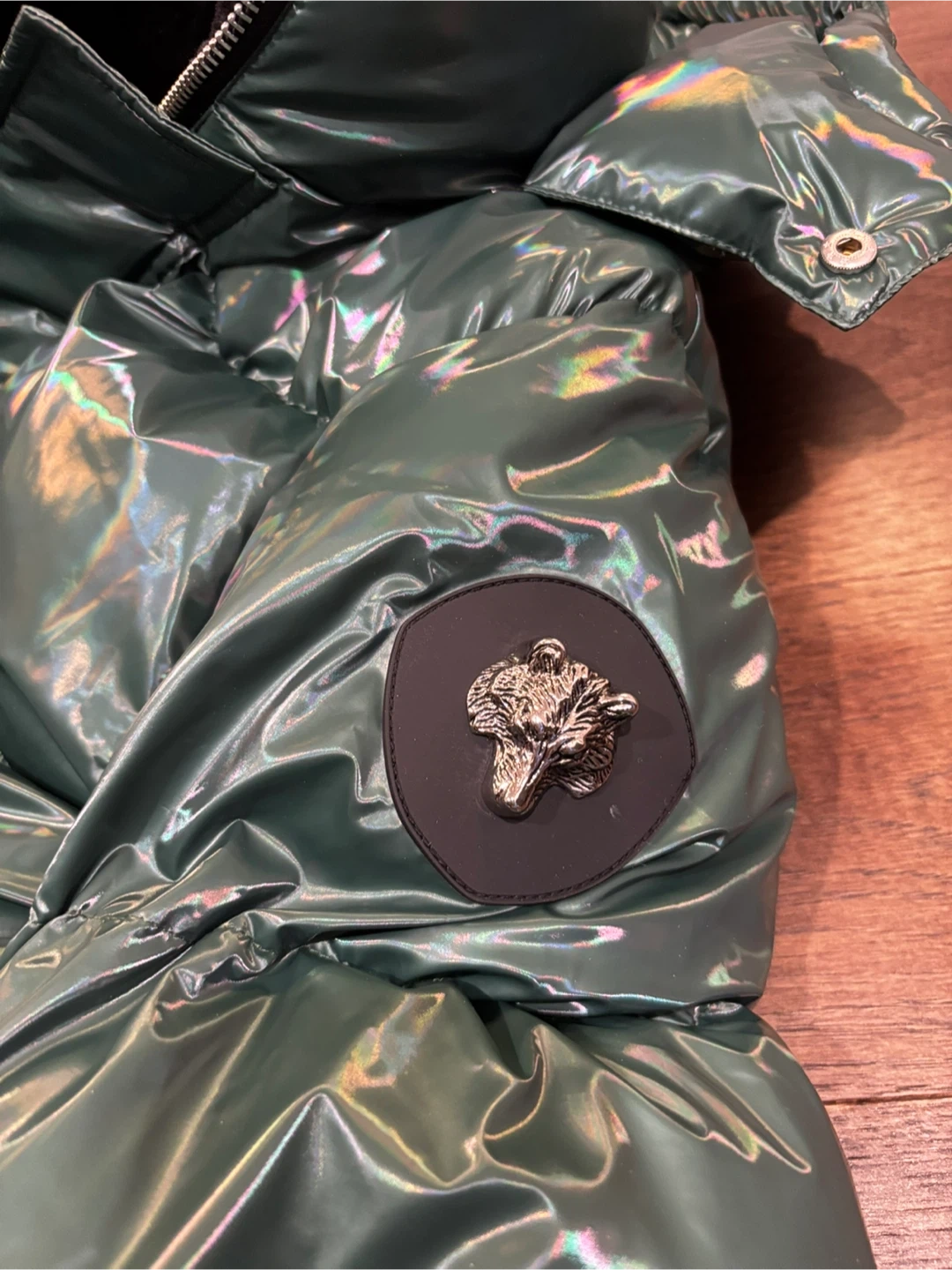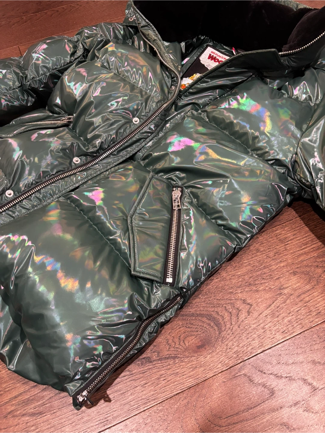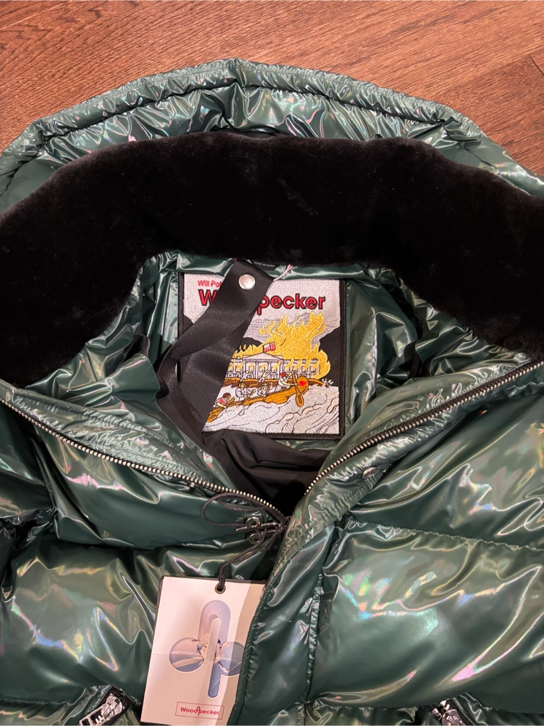 Brand new Shiny green Woodpecker puffer jacket with a faux fur-lined hood. Size M. It features zippered pockets and a distinctive woodpecker patch.