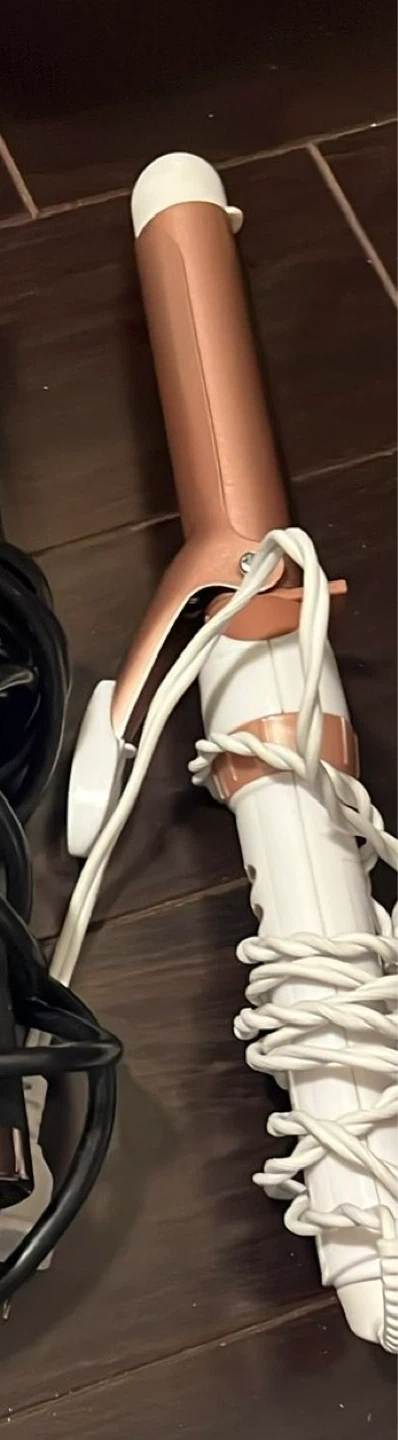 A rose gold curling wand with a white handle. Its barrel is designed for creating curls. This styling tool is great for achieving different hair looks quickly!