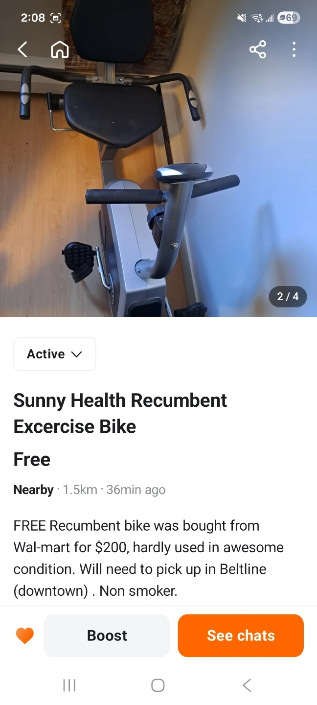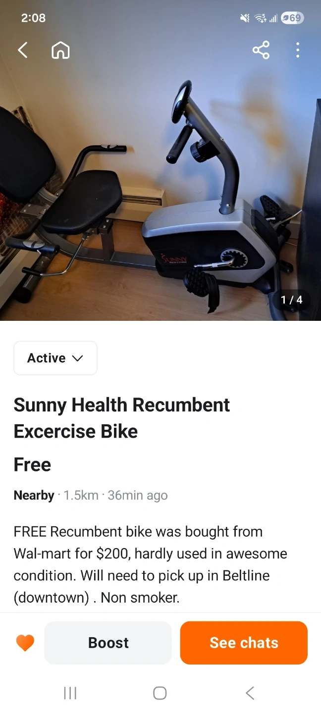 This recumbent bike was bought from Wal-mart for $200 and is hardly used. It's in awesome condition. Pickup required in Beltline (downtown).