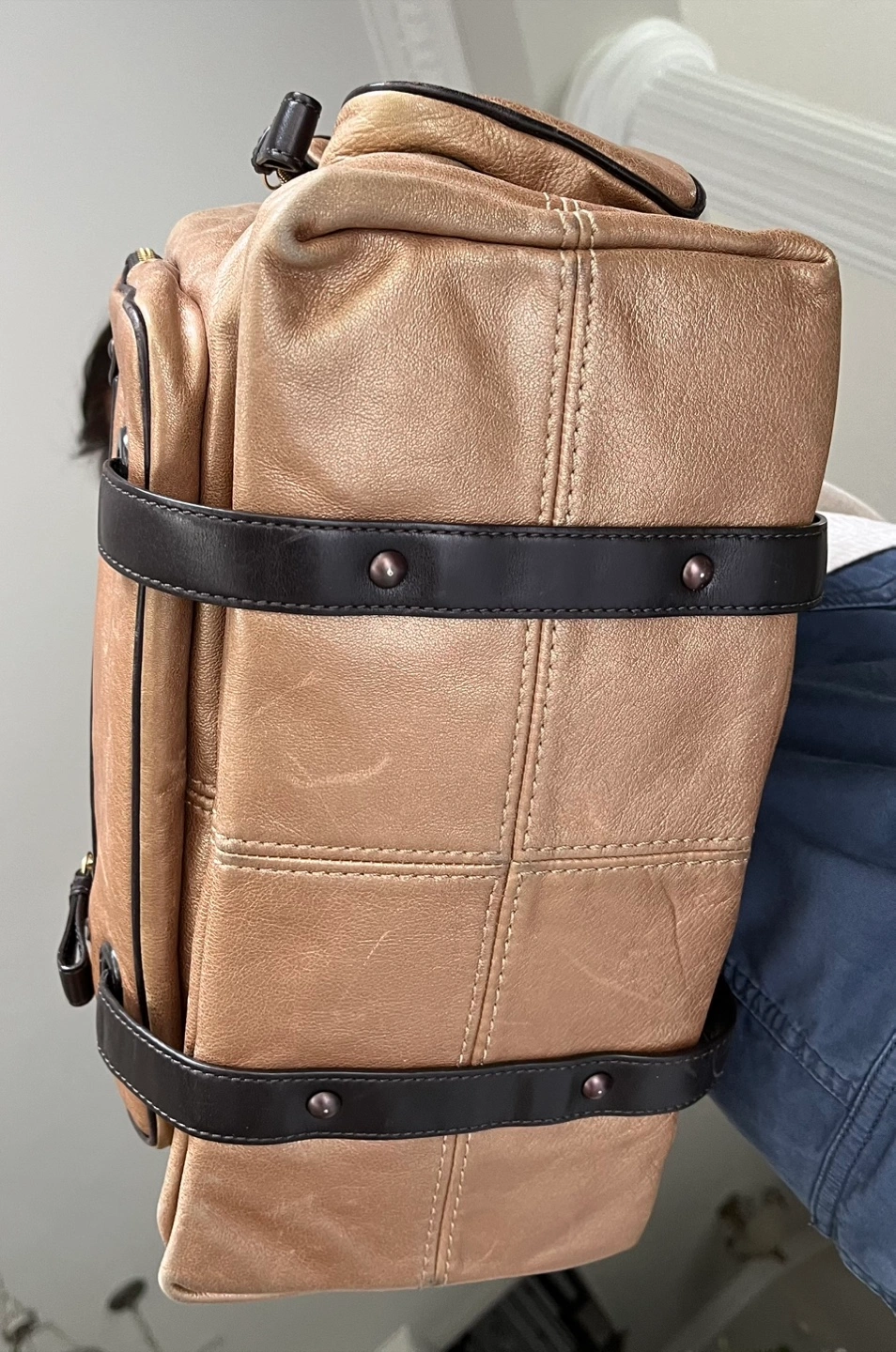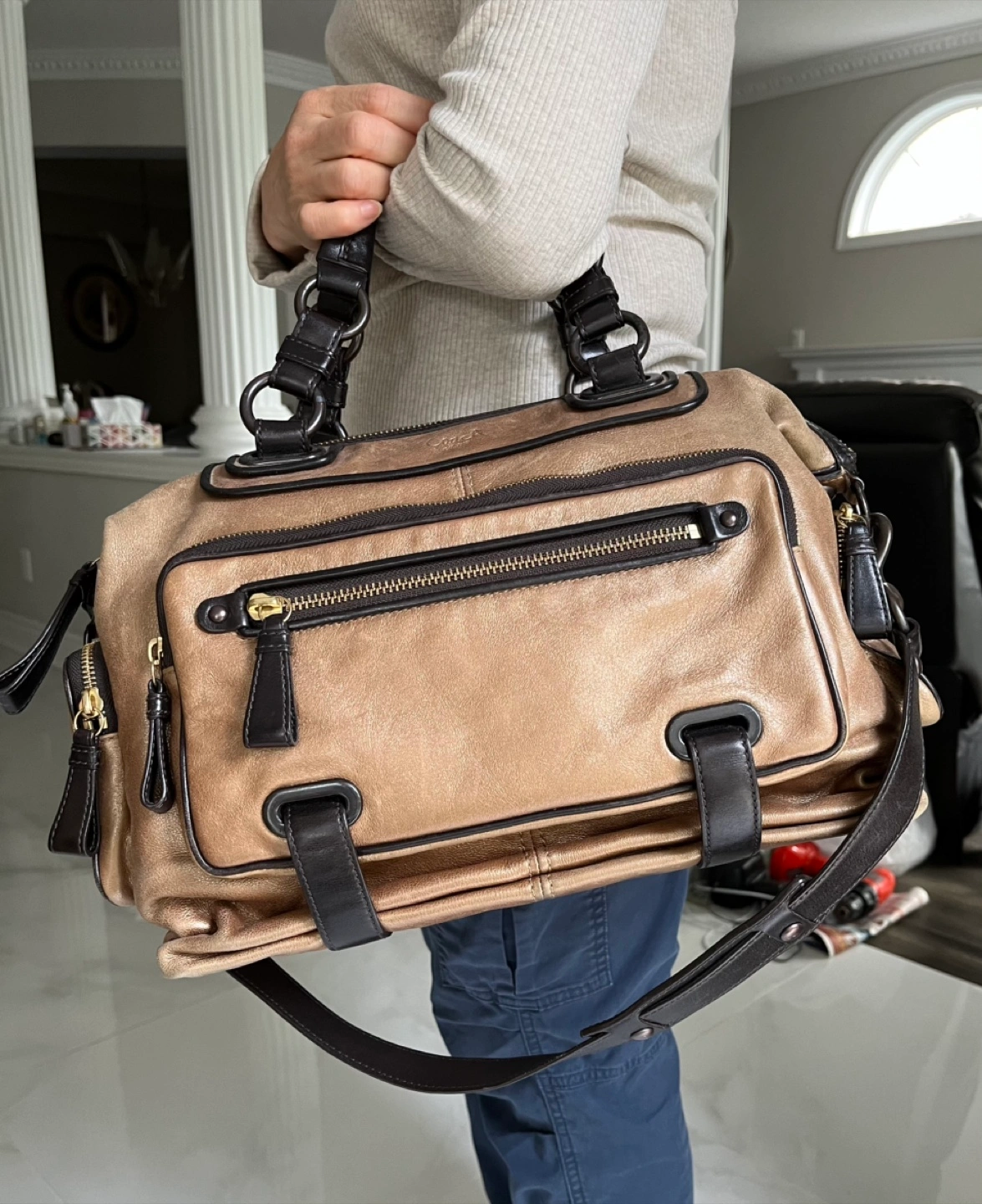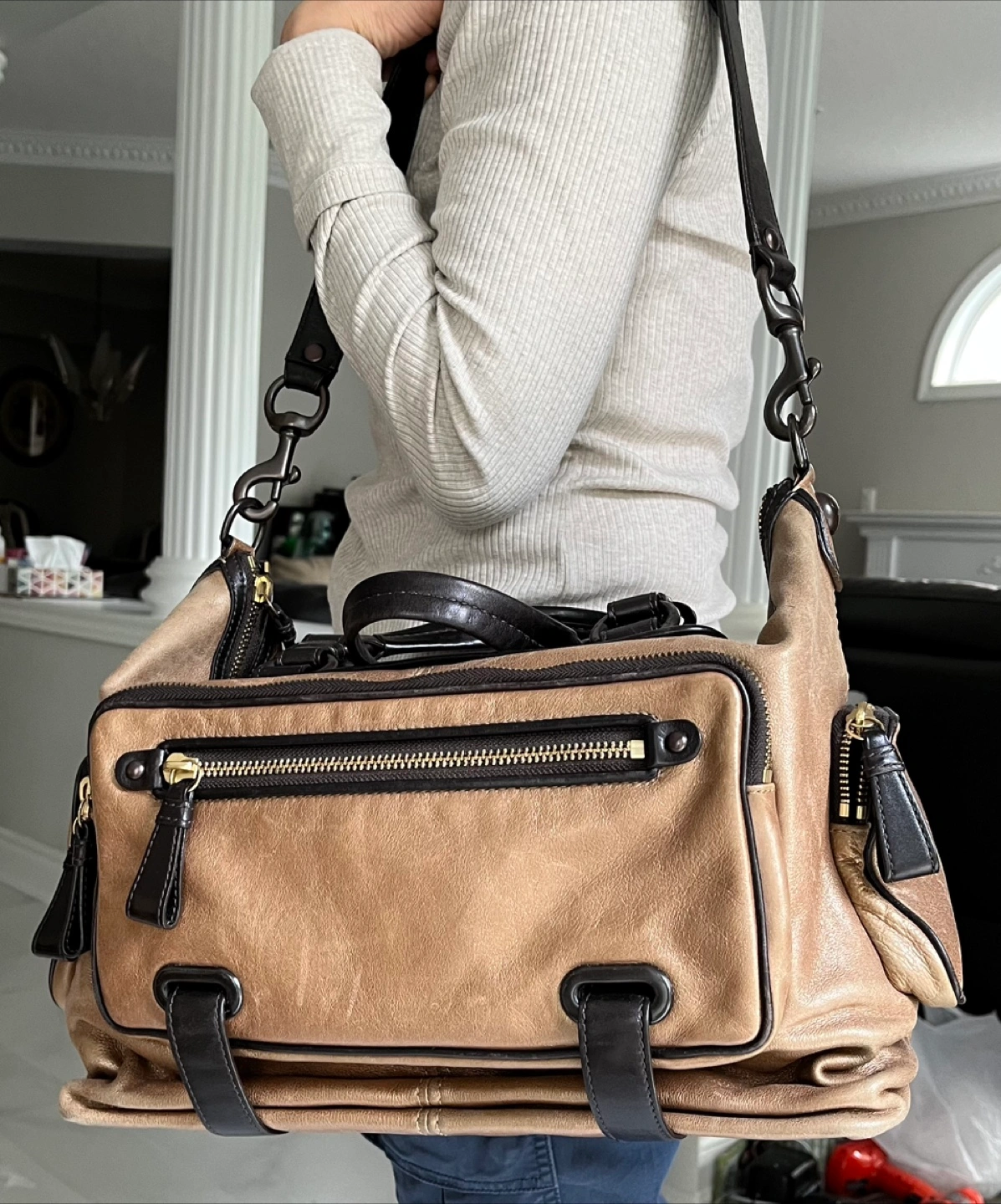 Coach leather top handle with strap, it has multiple zippers and pockets.