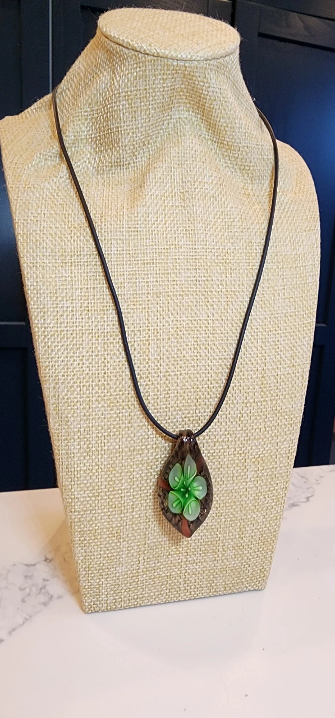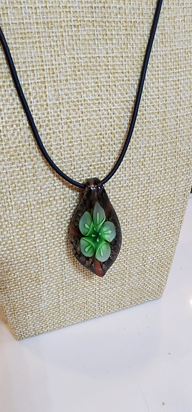 This is a unique handmade pendant necklace! The glass pendant features a green flower design with a brown and orange speckled background. The necklace is a black cord. It's a lovely piece to add a touch of artistry to any outfit