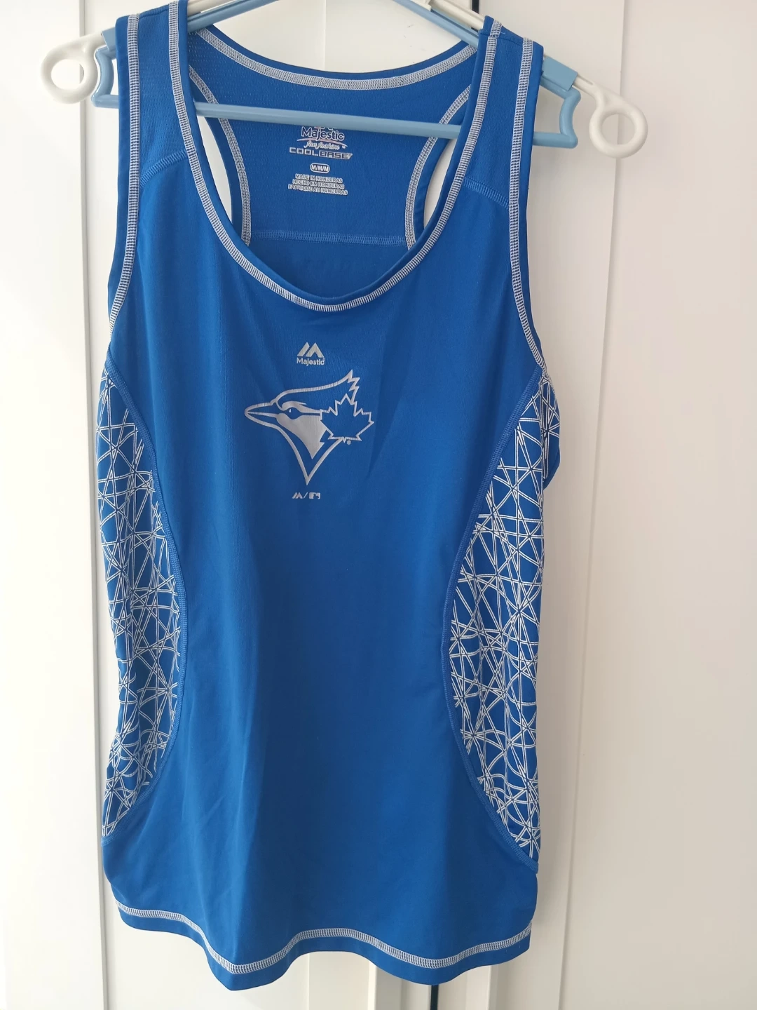 Majestic Cool Base tank top featuring the Toronto Blue Jays logo. Made in Honduras. Size M/M.