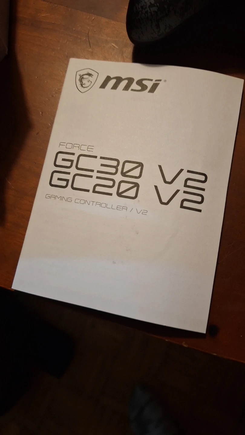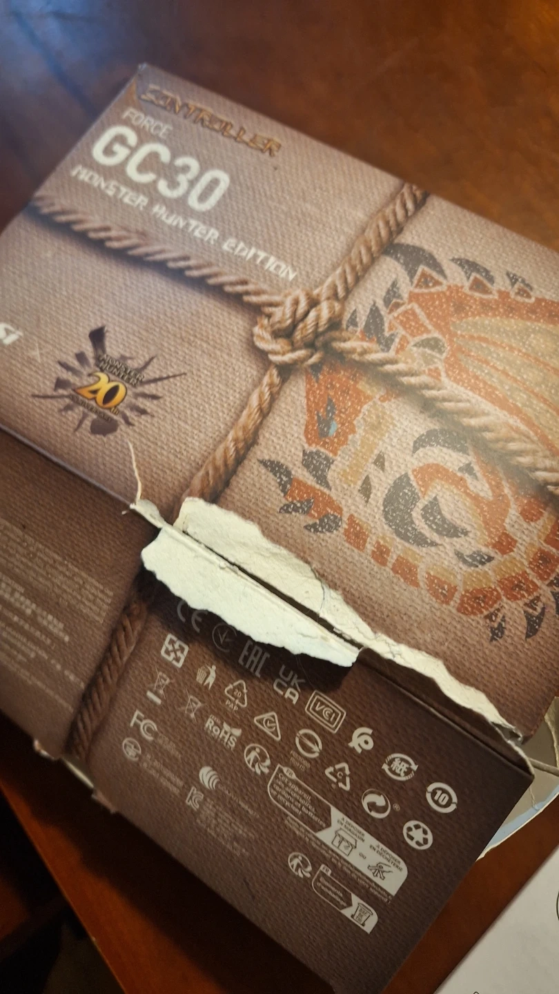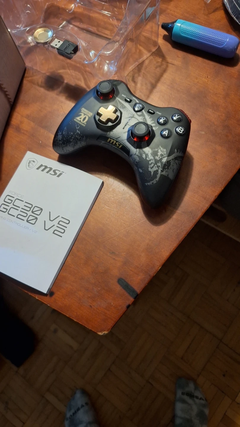 This is the MSI FORCE GC30 gaming controller in the Monster Hunter Edition. It's a wireless controller with a USB receiver included. It has a Monster Hunter 20th Anniversary design.