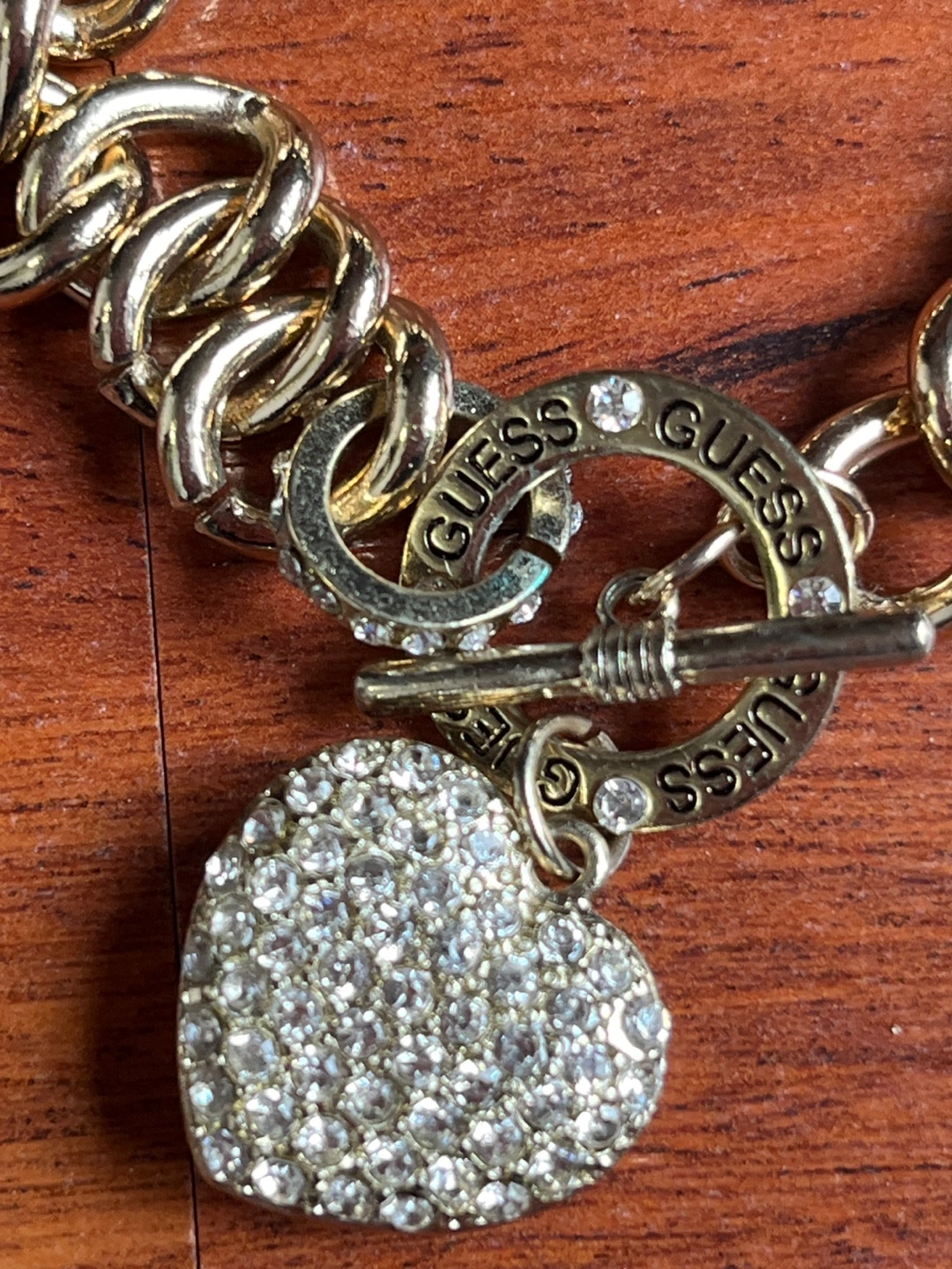 Check out this cute Guess bracelet! It features a gold-tone chain with a heart charm that's covered in sparkling rhinestones. The toggle closure has the Guess logo on it. It's in great condition and ready to add some bling to your outfit