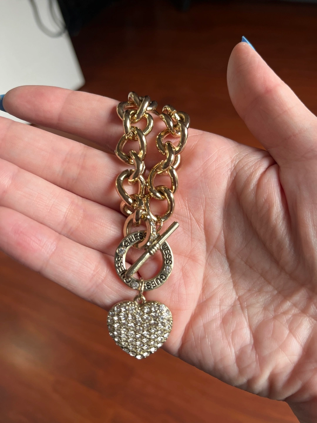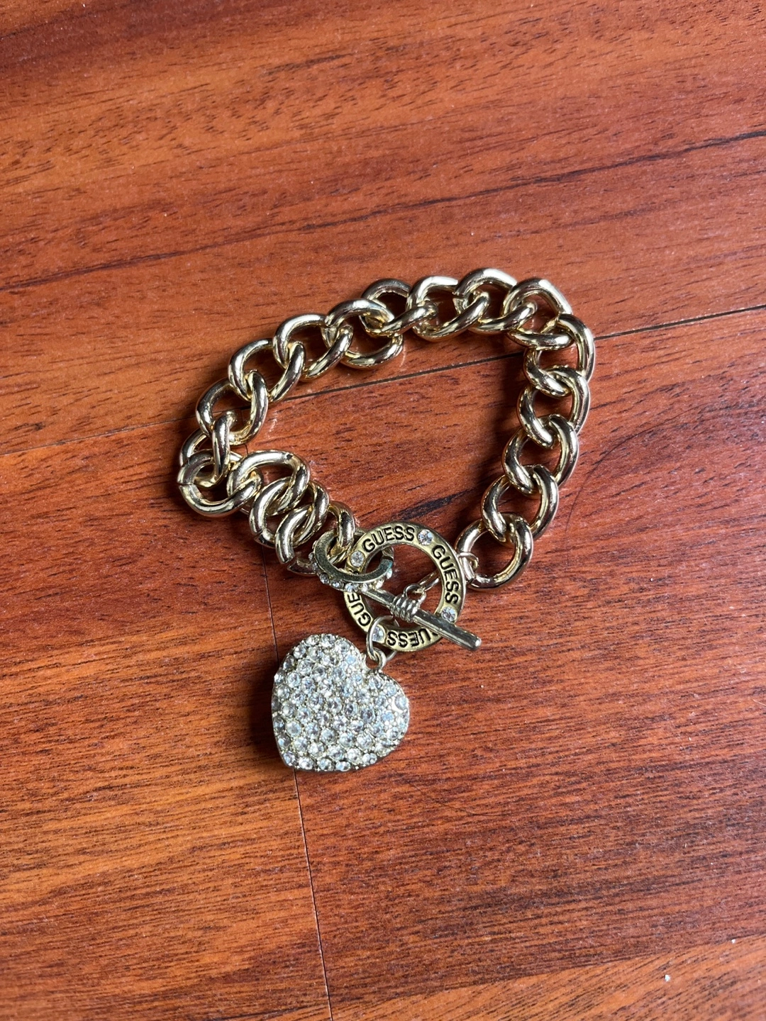 Check out this cute Guess bracelet! It features a gold-tone chain with a heart charm that's covered in sparkling rhinestones. The toggle closure has the Guess logo on it. It's in great condition and ready to add some bling to your outfit