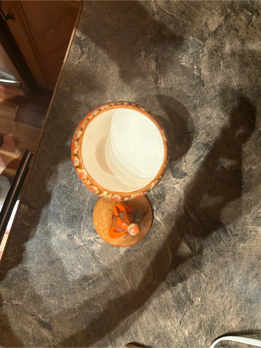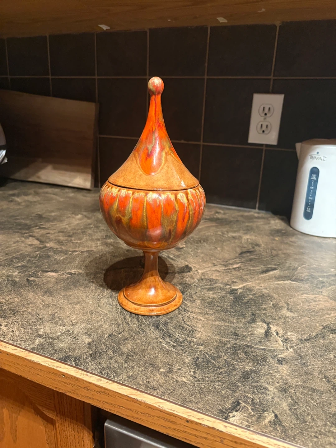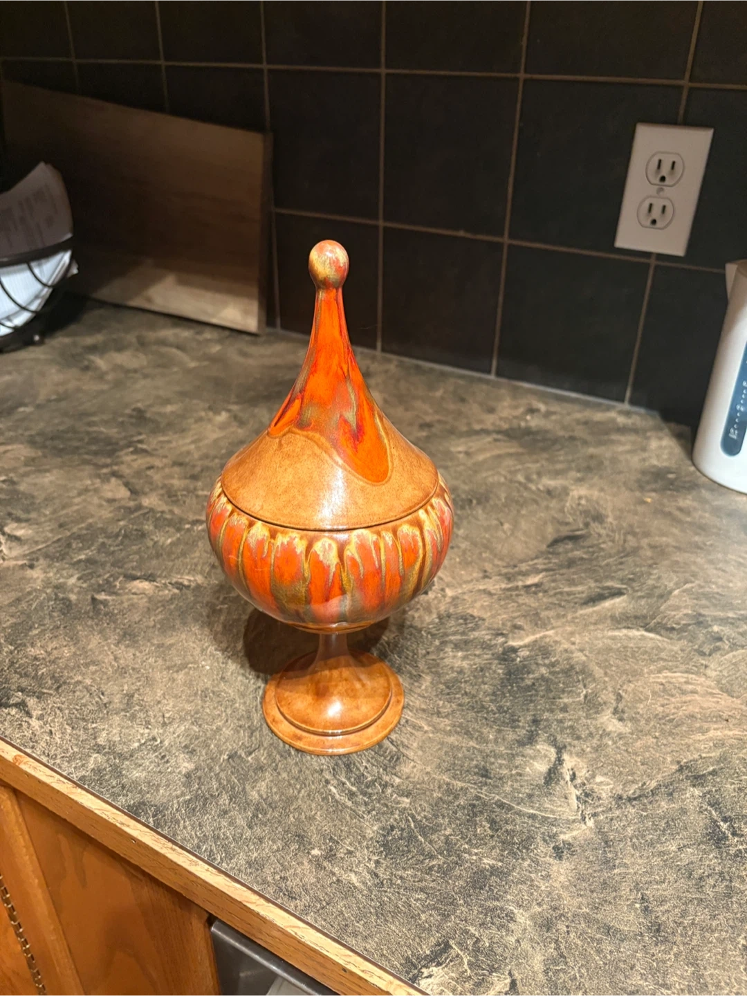 Selling a decorative lidded urn. It's a beautiful piece with a unique orange and brown design. Perfect for adding a touch of elegance to any room!