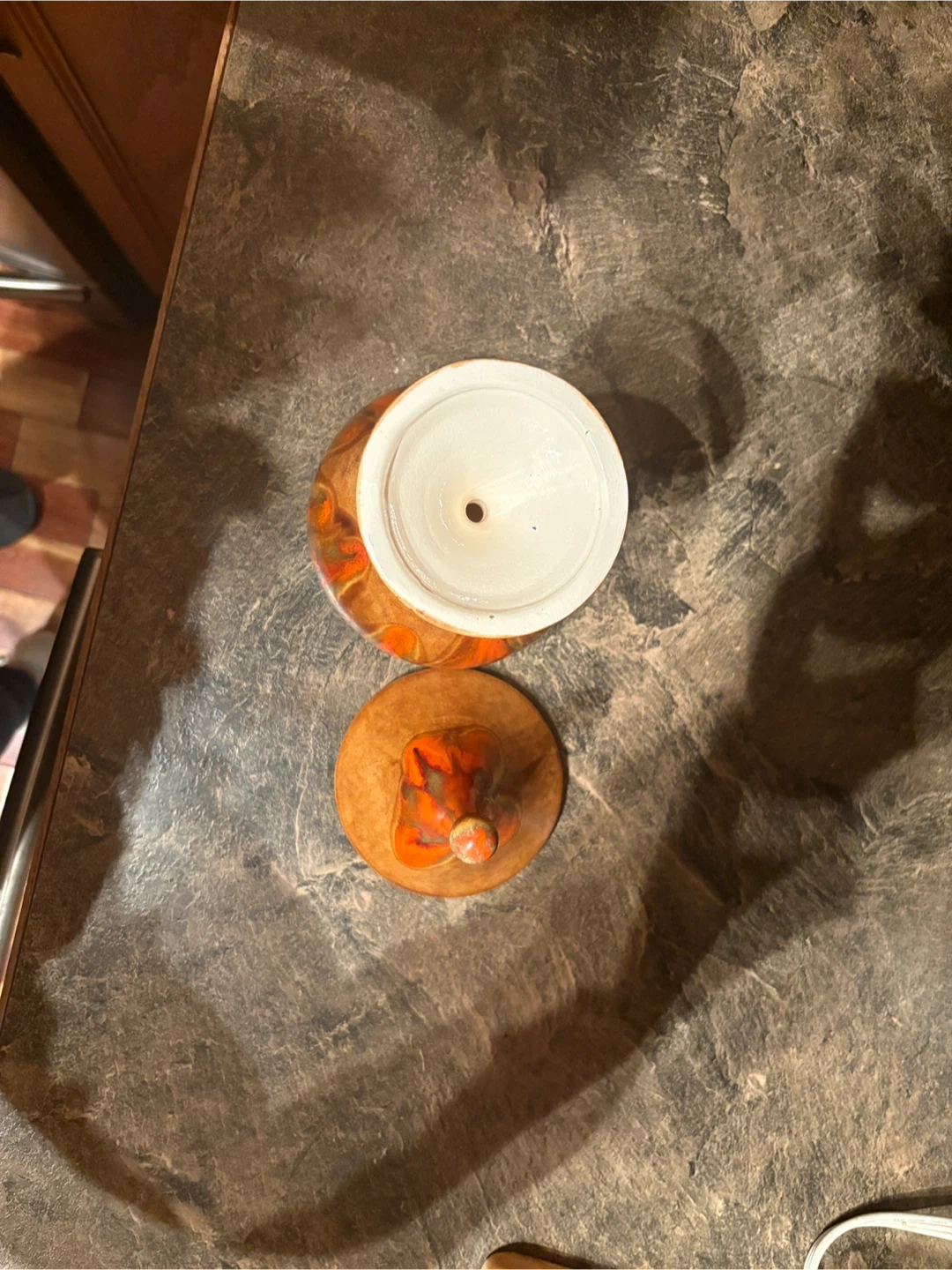 Selling a decorative lidded urn. It's a beautiful piece with a unique orange and brown design. Perfect for adding a touch of elegance to any room!