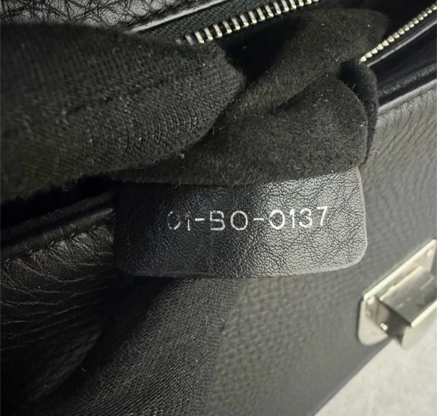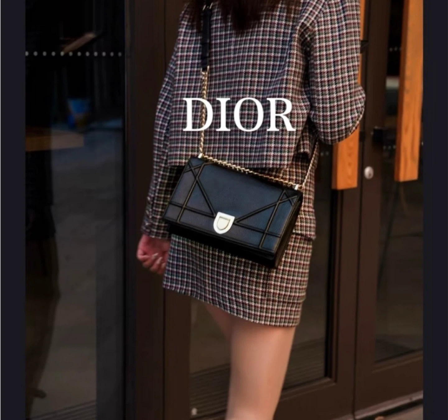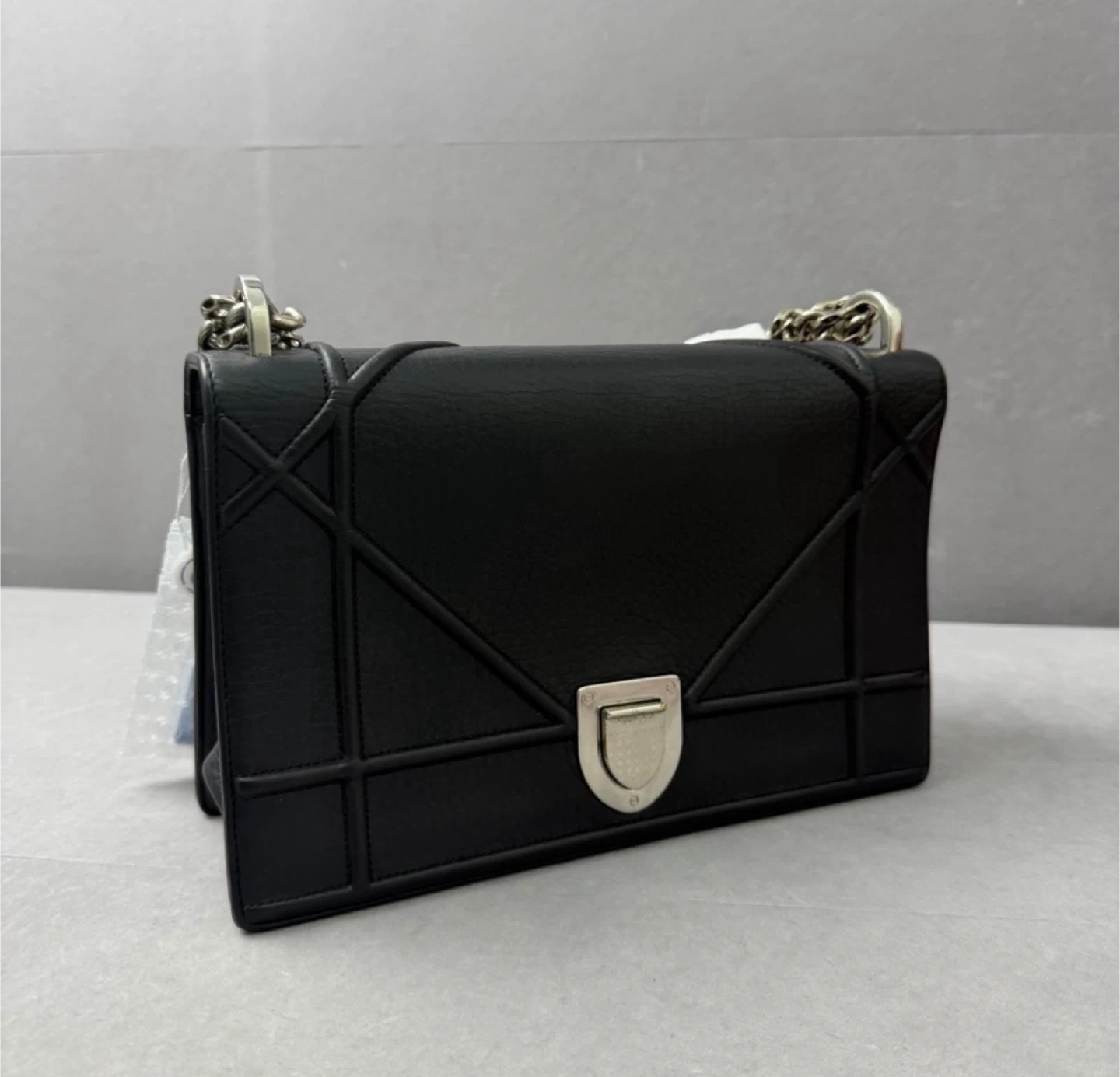 This is a black leather Dior chain bag. It features a textured leather finish and a signature clasp closure. Made with quality leather.