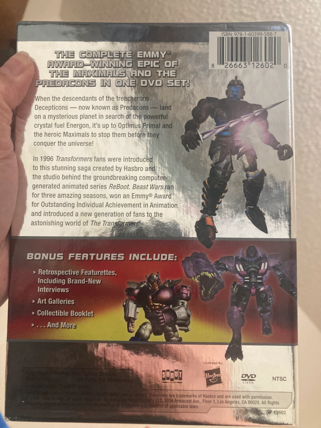 This is the complete 15th Anniversary DVD set for Transformers Beast Wars. It includes all three seasons of the award-winning CGI animated series. Bonus features include retrospectives, brand-new interviews, art galleries, a collectible booklet, and more!