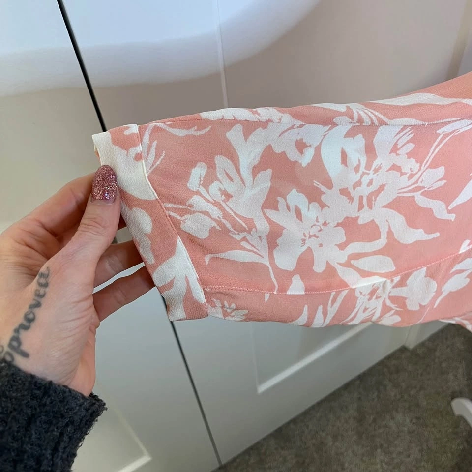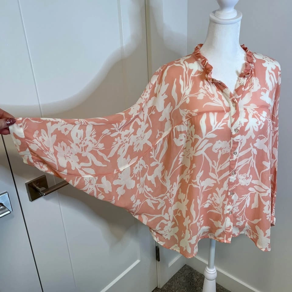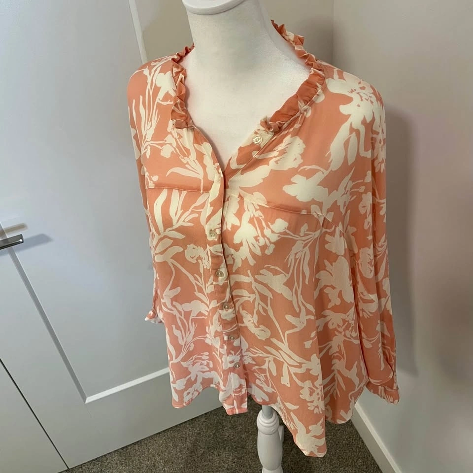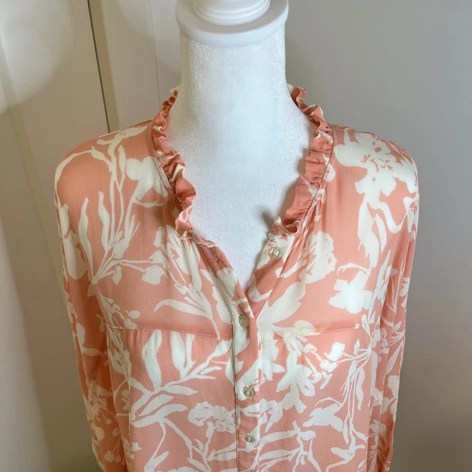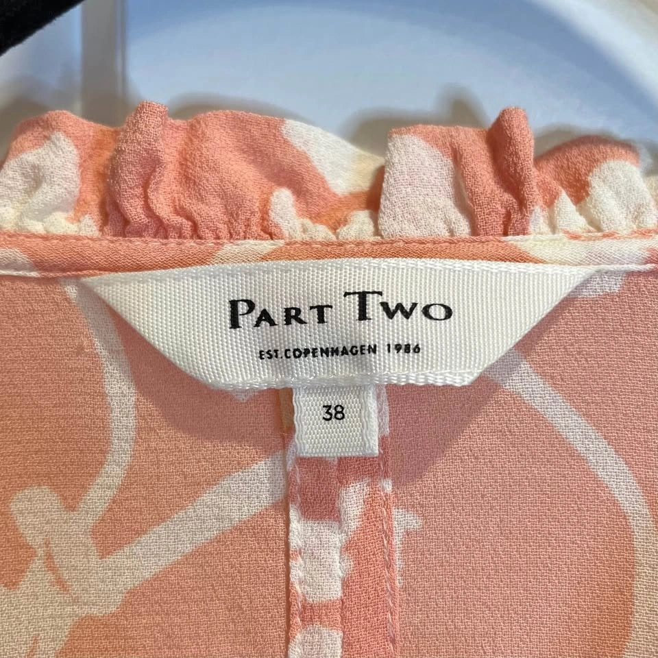 Elegant floral blouse in a soft peach hue by Part Two. Lightweight material. Button down front. Ruffled neckline. Comes with an extra button attached to inside tag. Size 38.