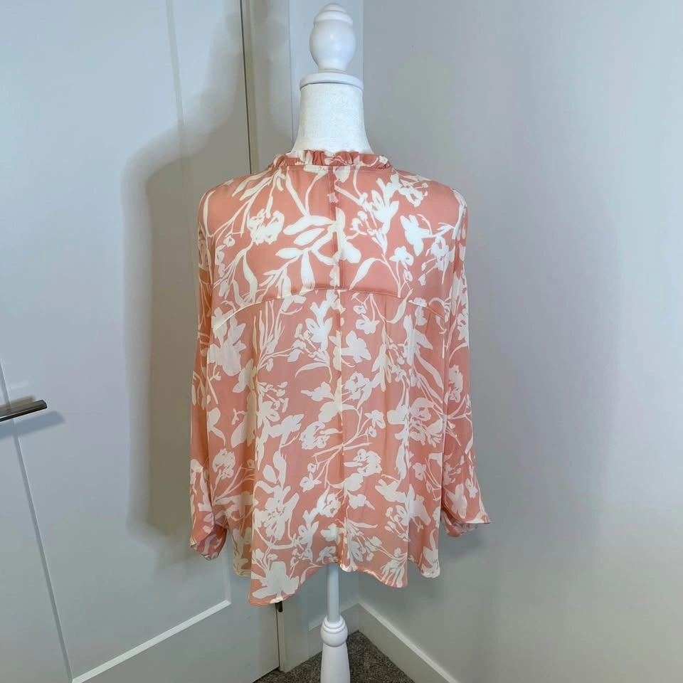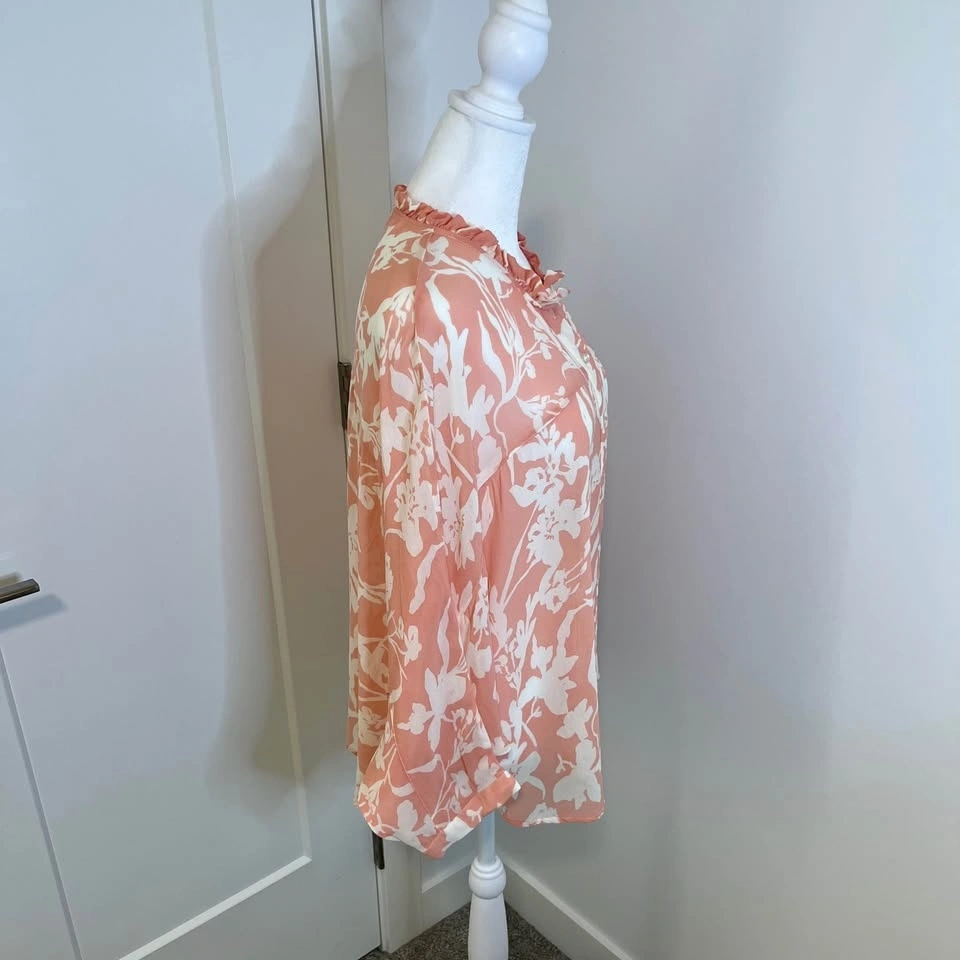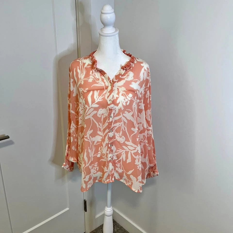 Elegant floral blouse in a soft peach hue by Part Two. Lightweight material. Button down front. Ruffled neckline. Comes with an extra button attached to inside tag. Size 38.